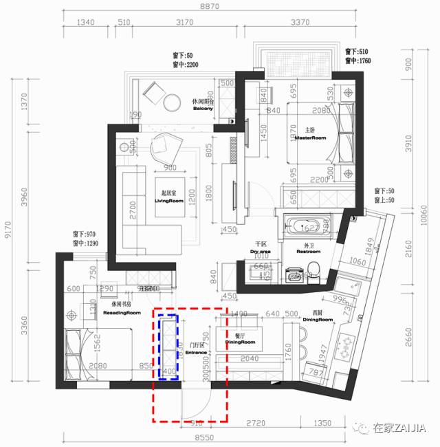 在布置前,不妨先认识一下你家的玄关是属于哪种类型。(下图红色虚线区域为玄关区,蓝色虚线区域为衣柜区。)