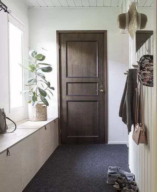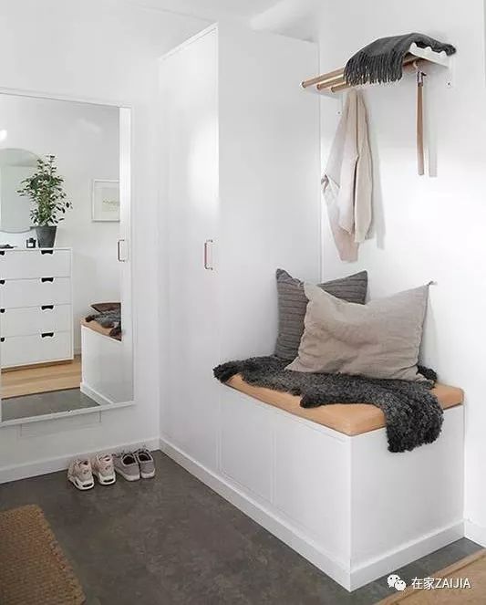 玄关靠窗,别提有多棒。做一排能储物的小飘窗,换鞋凳+鞋柜+杂物柜就全部都有了,包包和外套可以在进门后随手挂在对面的挂钩上。