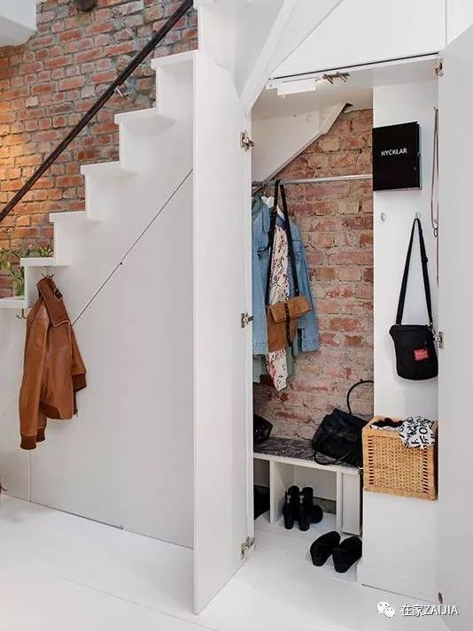 入户既是楼梯的户型,改造一下刚好变成一个内嵌式mini衣帽间。