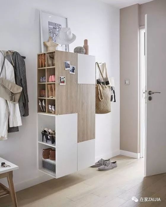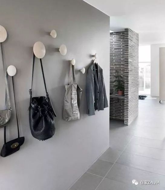 对于小开间户型,也可以试试在入户门周围做文章,倒立的L型储物架,刚好形成了鞋柜、挂衣区和上方杂物储存区三个区域。但对于这样的开放式的收纳架,东西一多就显乱,建议可以尽量选择同色系的物品再此收纳。