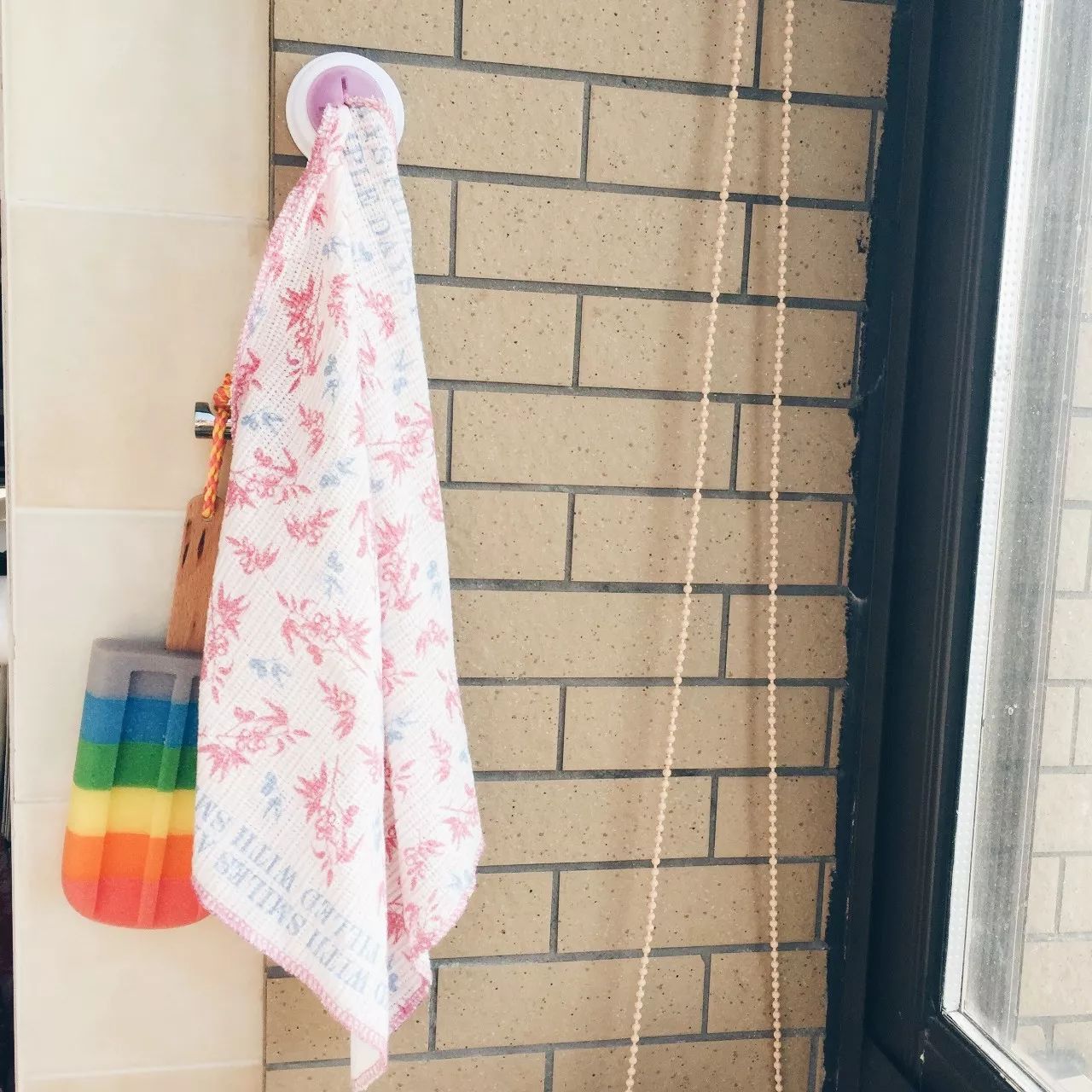 中间粉色部分是软塑料,只要拎着毛巾的一角往粉色区域一摁,粉色的十字口就能夹住毛巾了,特别适合贴在洗手台边,随时收纳洗碗巾。