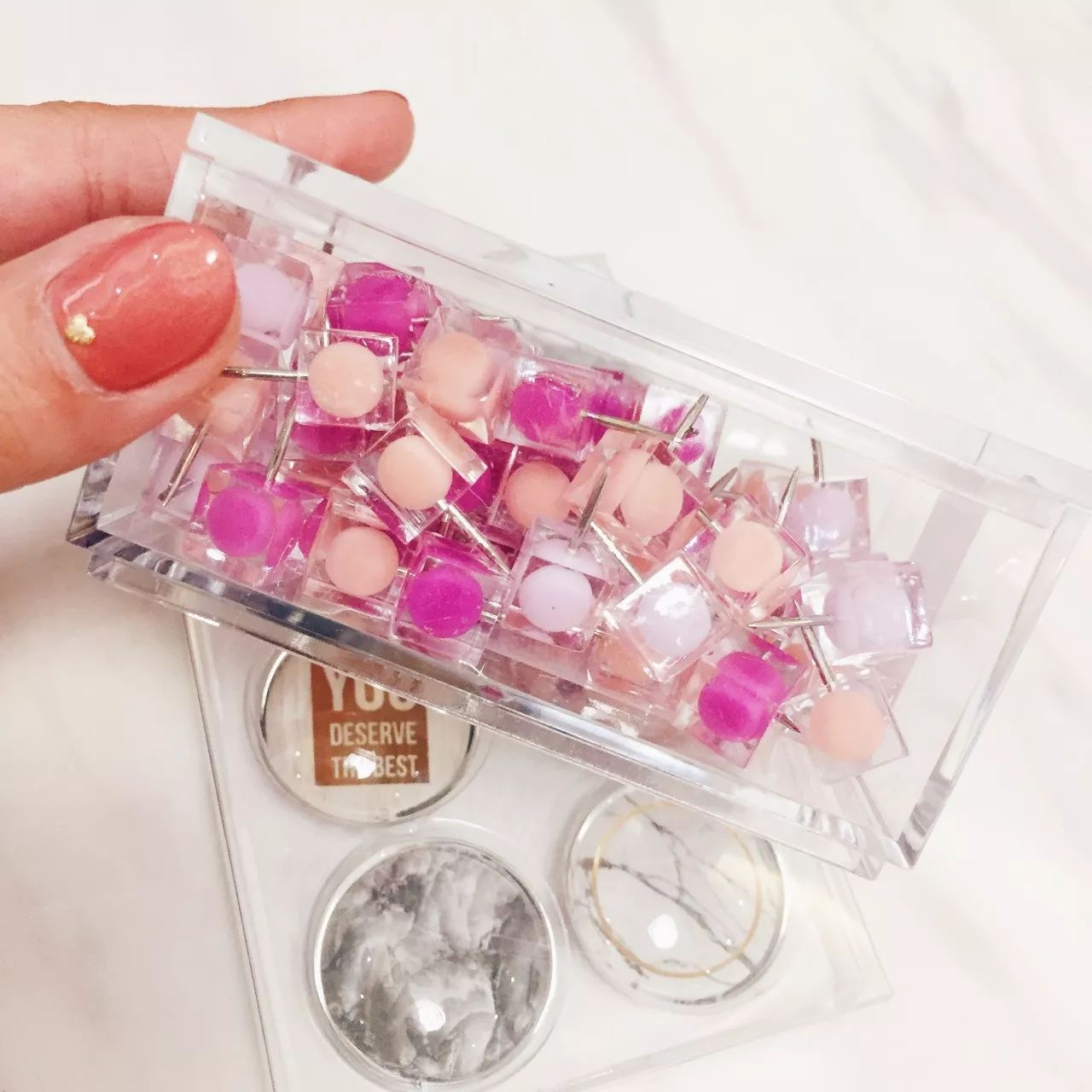 这款三色图钉,每一粒圆头图钉都包裹了一层透明的正方形外壳,看起来晶莹剔透可爱度满分!