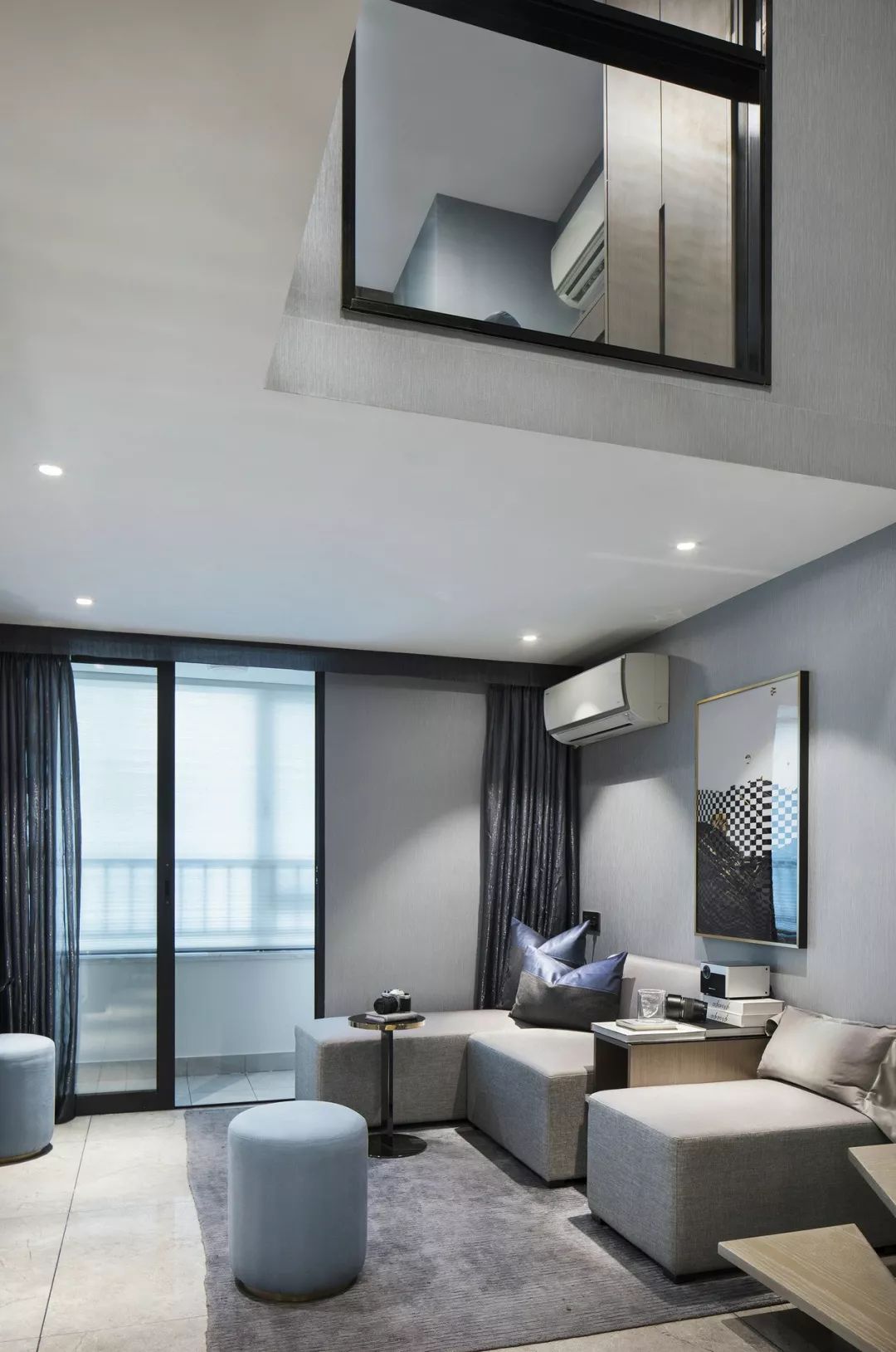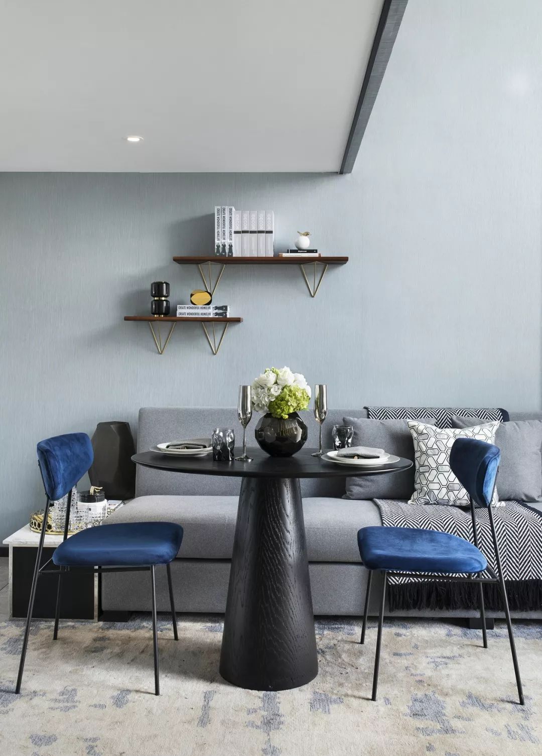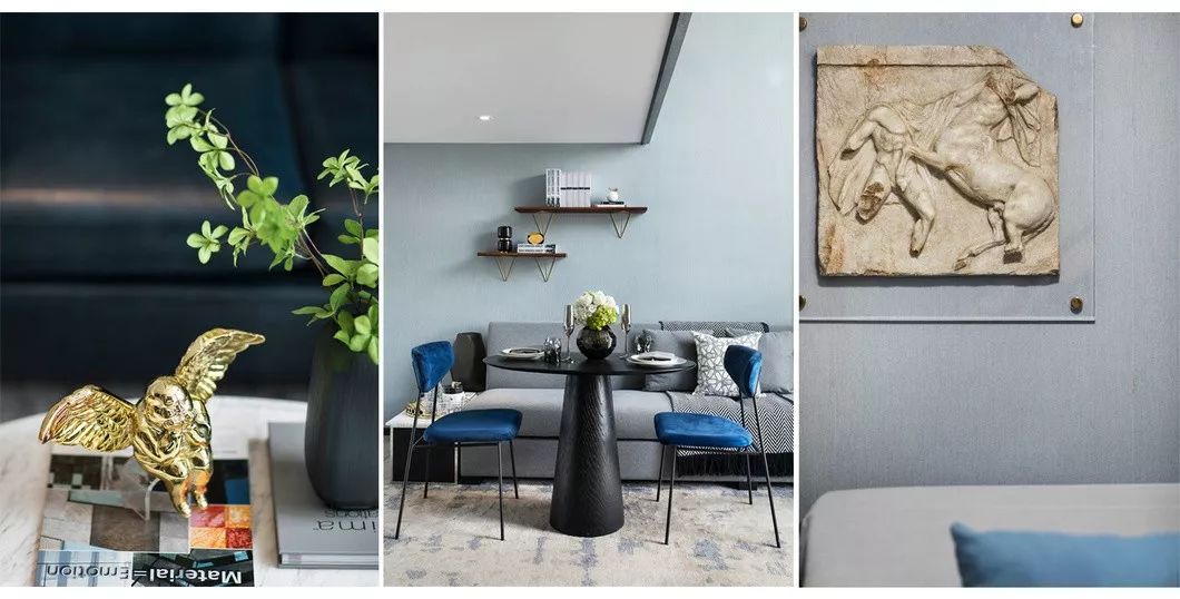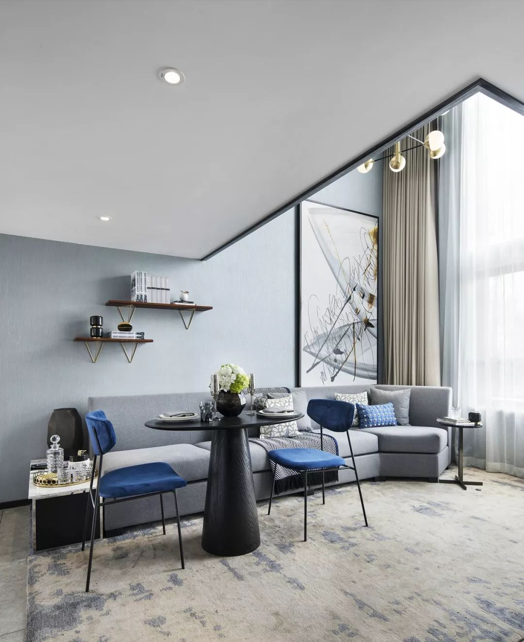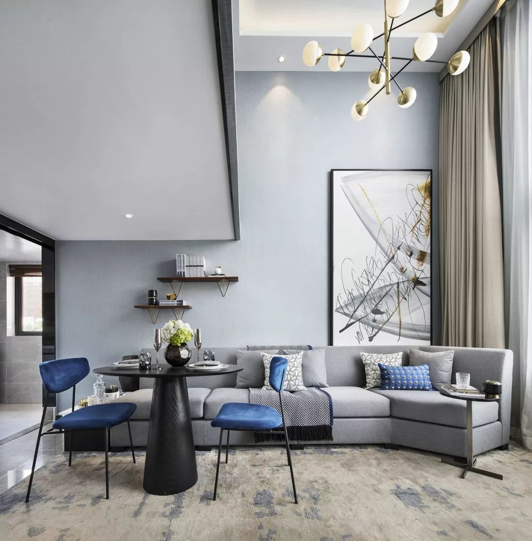 客餐厅拼合成一个大空间,两层挑高的落地窗将阳光引入。亮蓝色与高级灰家具完美搭配,后现代主义抽象艺术品、几何线条的不凡魅力充斥在空间中,呈现一种至臻完美的生活情景。