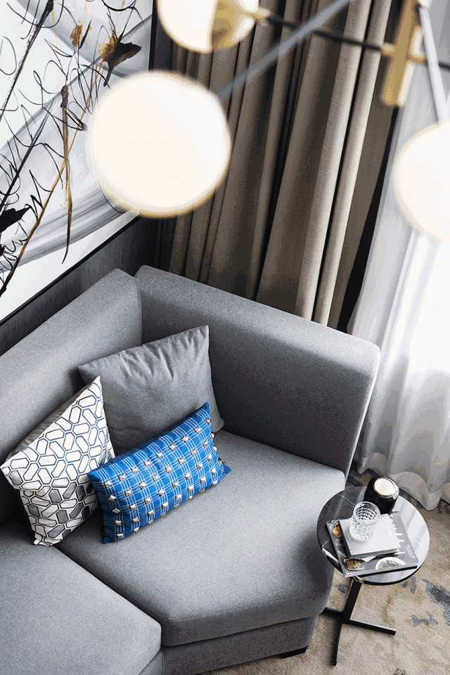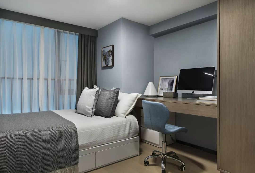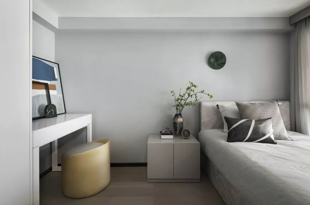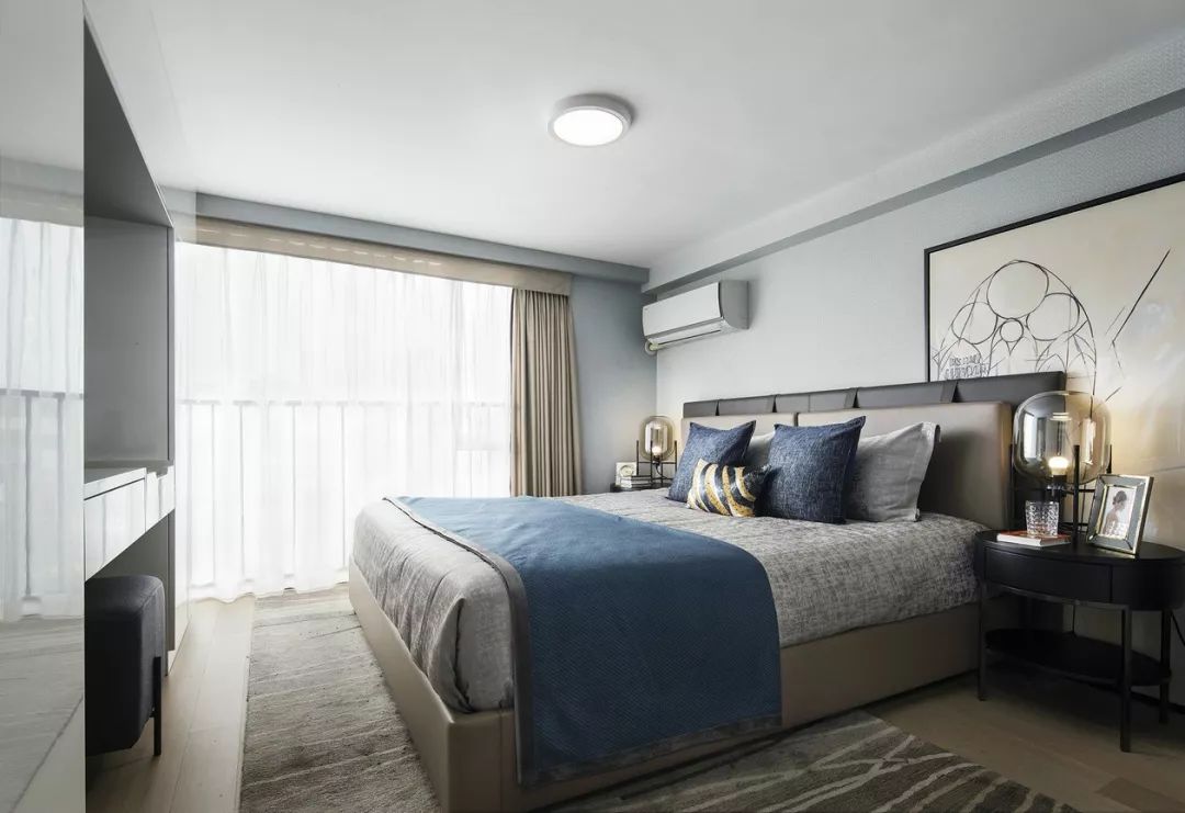 卧室依旧延续主色调的搭配,蓝色系的幽静高雅、灰色调的朴素恬淡,营造远离喧嚣的生活氛围。
