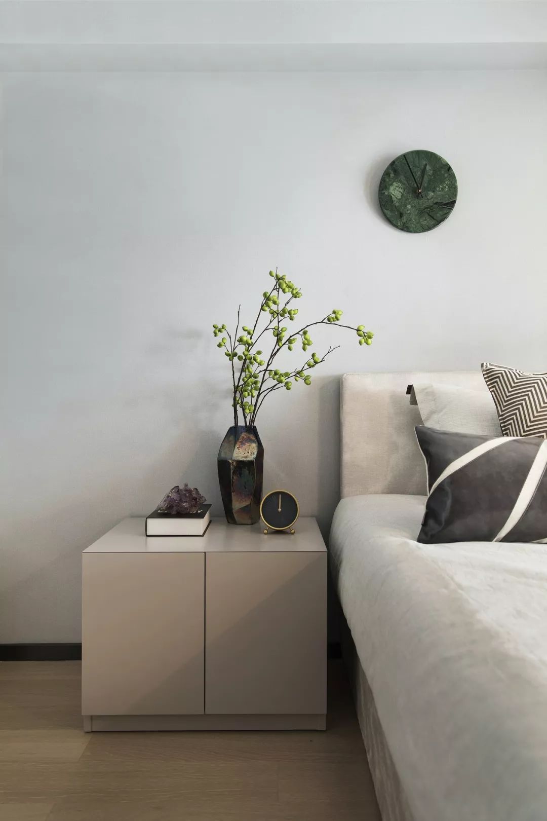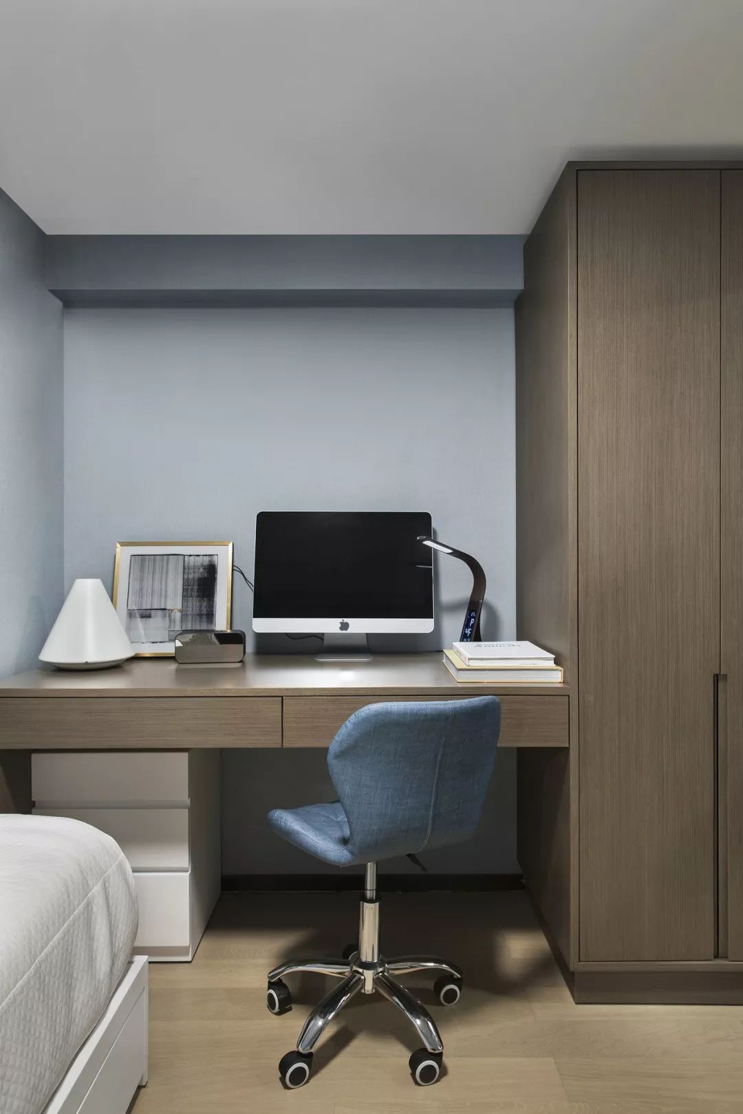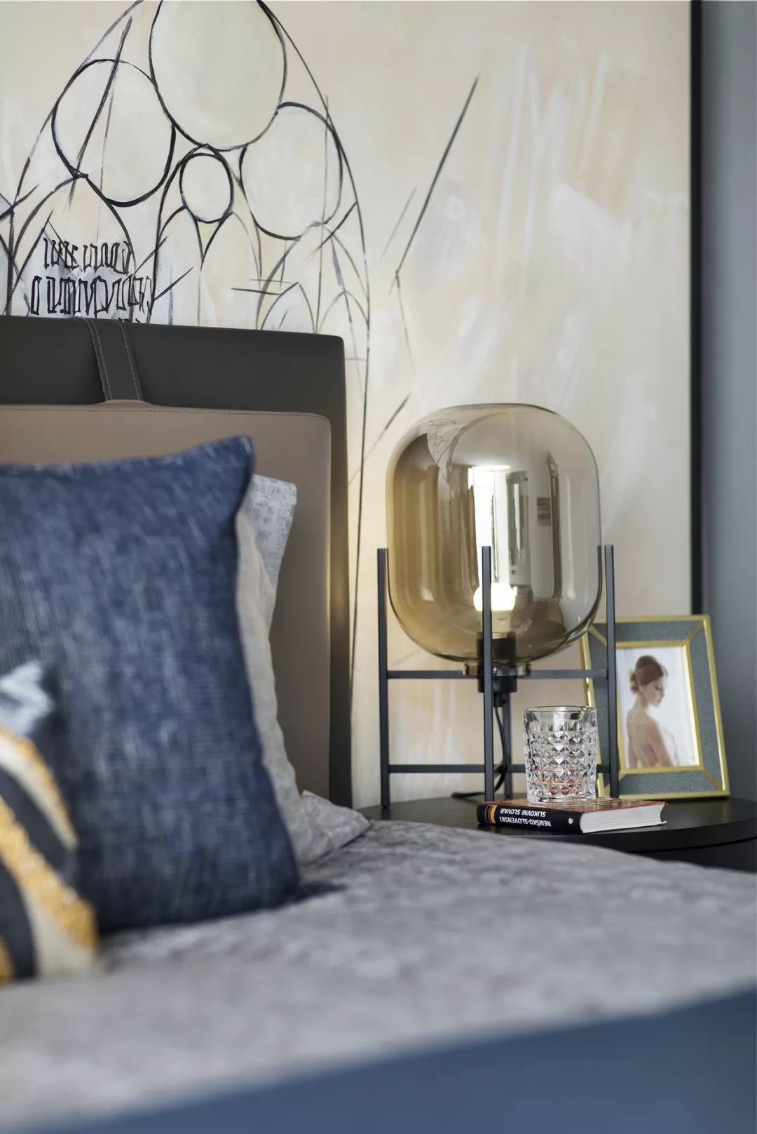 卧室依旧延续主色调的搭配,蓝色系的幽静高雅、灰色调的朴素恬淡,营造远离喧嚣的生活氛围。