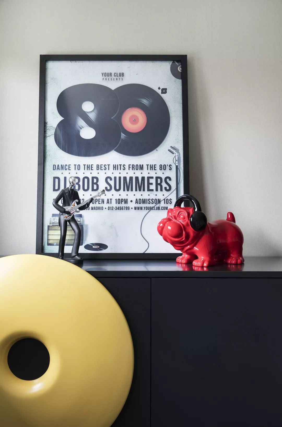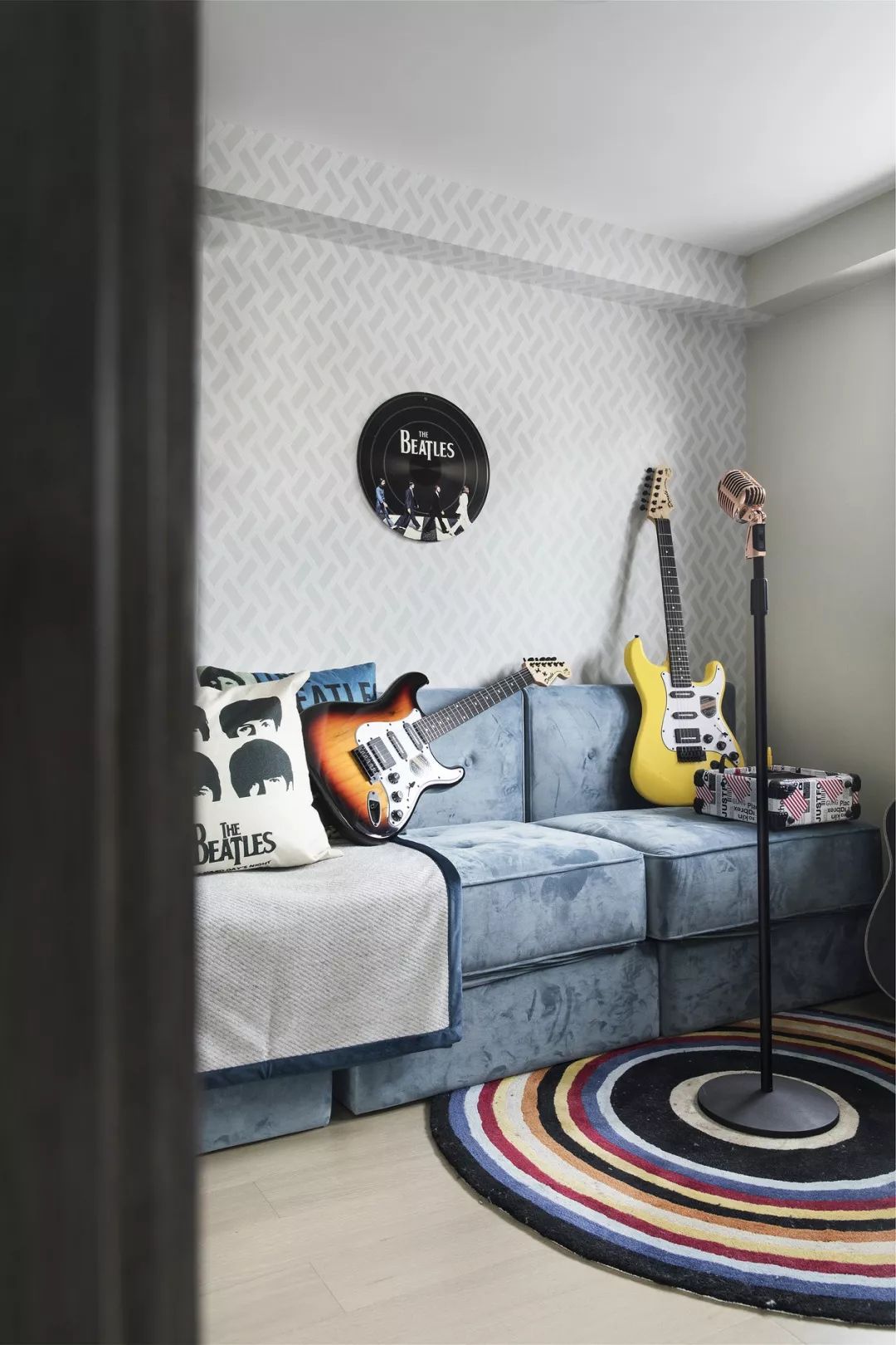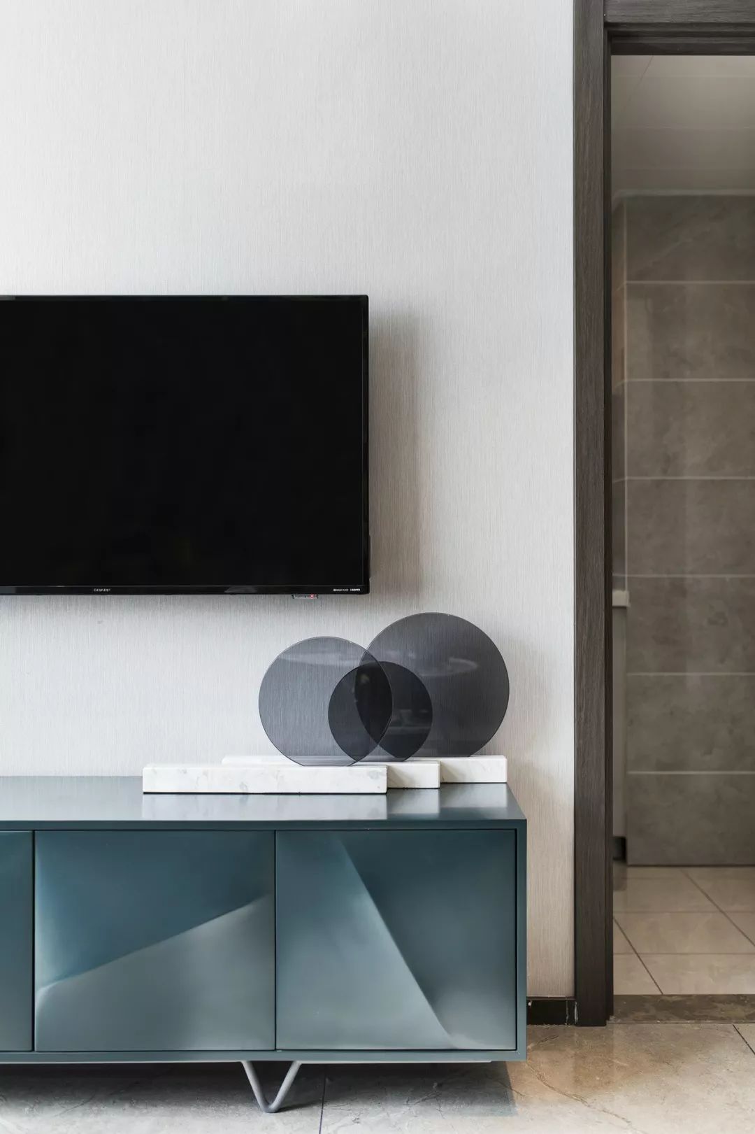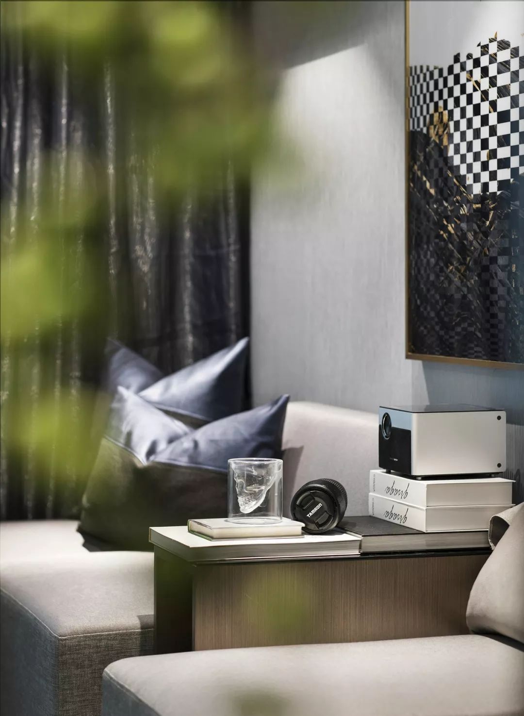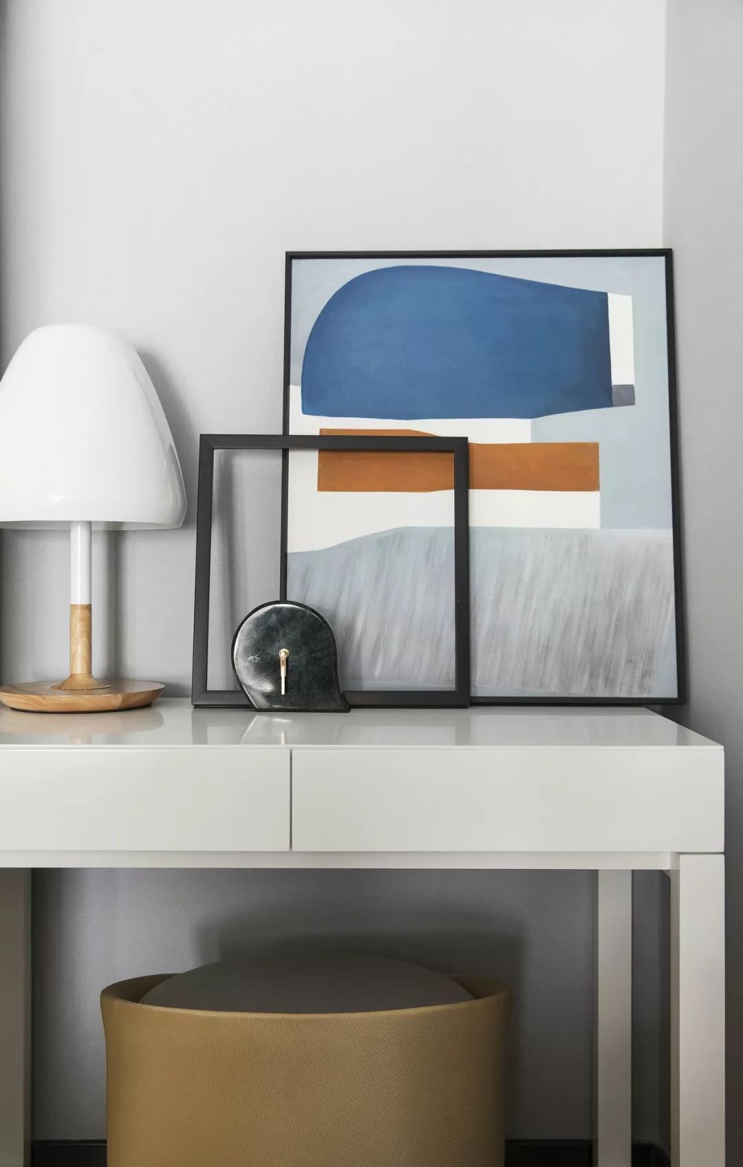 简约组合沙发、像素艺术画、经典莫兰迪色系——雾霾蓝坐凳,空间各处软饰在随意中呈现极简生活的干净感。