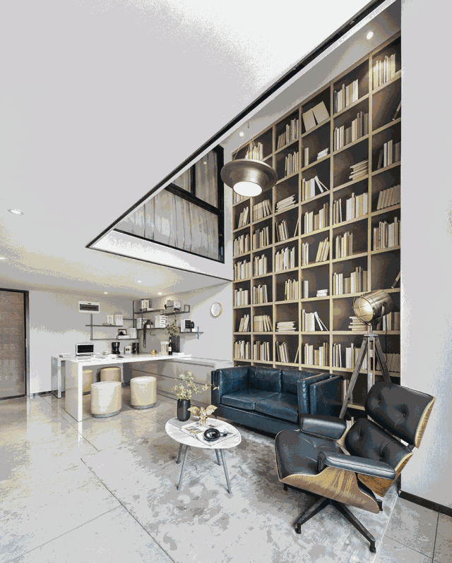 客厅挑高的背景墙使用书架壁纸装饰,于静谧中弥散出震撼无比的恒久物感。