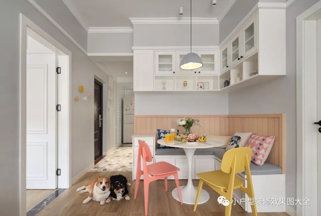 简约的白色与淡淡的灰蓝色搭配的墙壁,餐桌是卡座的样式,粉色和黄色的糖果色,明亮可爱,卡座的设计也是很好看的,卡座的上方安置的是一些收纳柜,充分利用了空间。