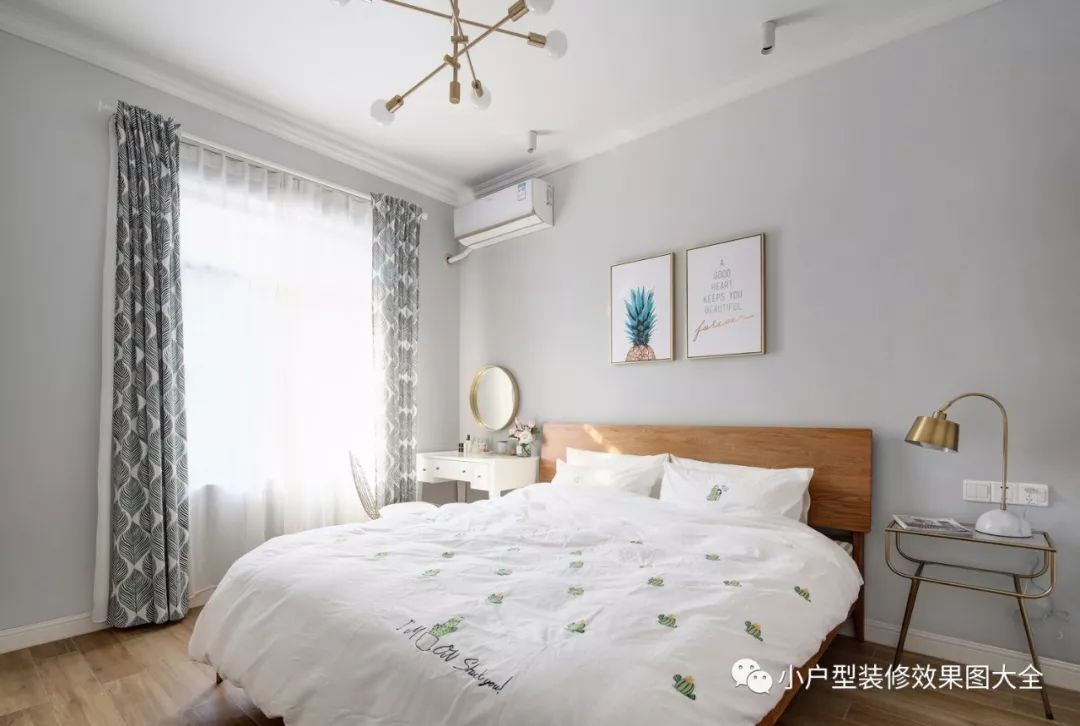 卧室的装修效果很是简约清新,墙壁的颜色没有白色墙壁的强烈的耀眼的感觉,墙上就仅仅是简简单单的装饰了两张文艺画,很有宁静的感觉。