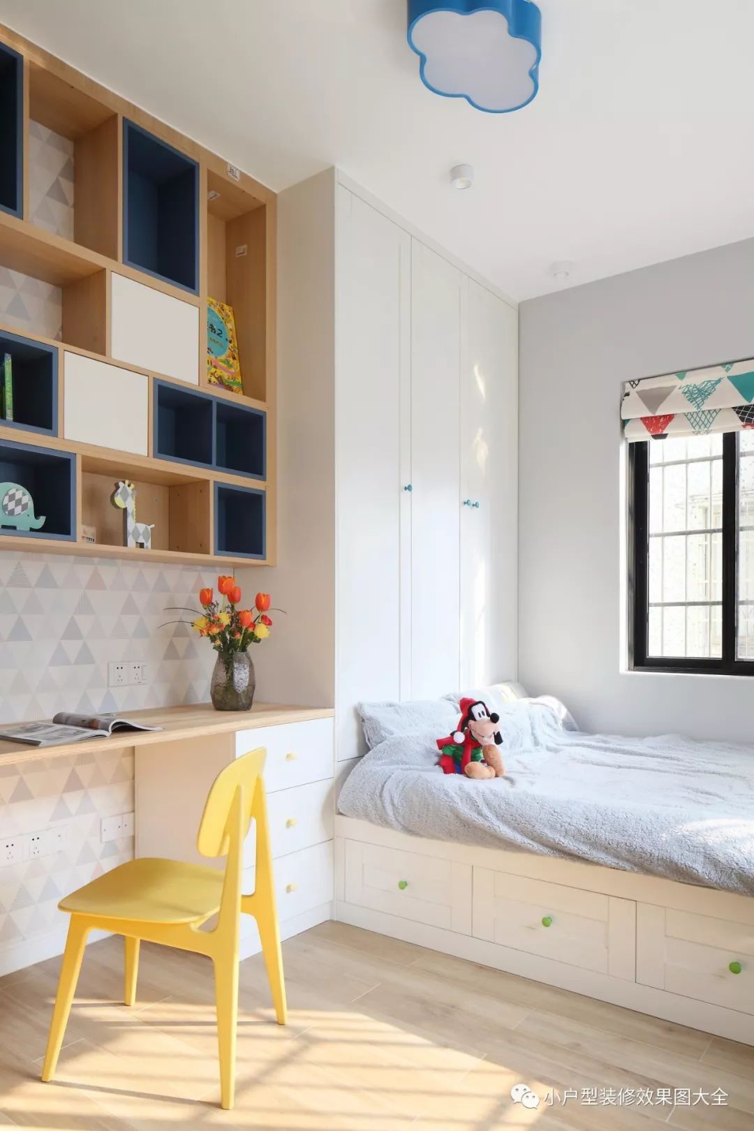 儿童房的设计就比较的活泼灵活了,白色和原木的颜色很是柔和,房间里的各种鲜艳的颜色正好点缀了房间。