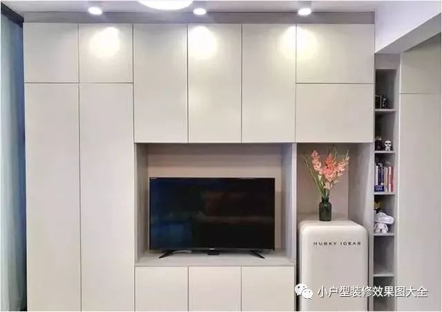 电视背景墙和玄关是一个整体的定制橱柜,电视和小冰箱就内嵌在这个大橱柜里,电视橱柜上房还有几盏筒灯装饰,简单却很实用。