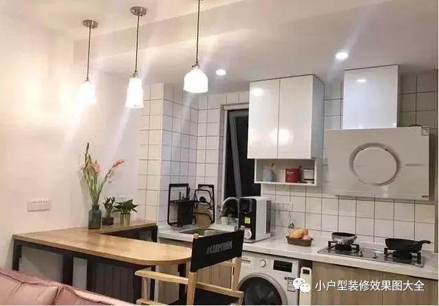 厨房和餐厅的组合设计就在沙发的后方,开放式的厨房,一字形的厨房空间格局,白色的瓷砖背景墙,美观耐脏也比较好打理,各个功能区也是很分明。吧台式的餐厅就在角落里,三盏精致吊灯装饰,很有温馨感。