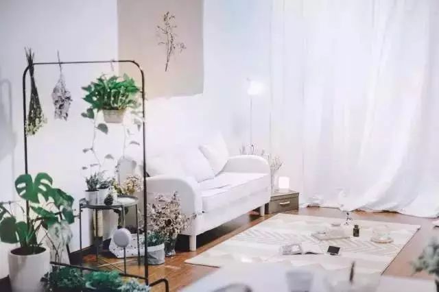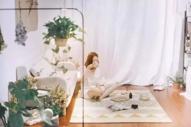 客厅里的沙发也是白色,沙发的旁边用了淡色块的地毯做装饰。这两个角落是她平时最爱呆的地方,也是朋友们来访时最爱取景的圣地。在这个没钱就没有好装修的年代,真的有人在用不多的钱过着不凑合的日子。
