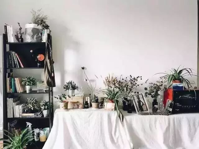 电视墙被一个投影仪取代,白色麻布成了台面的基底,上面放满留各种小盆绿植、干花、仙人掌,还有一些零落有趣的小摆件。