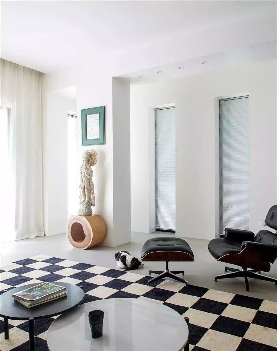逐光而居 当色彩和光影相遇建筑空间便会异彩纷呈客厅设计优秀建筑是自然的延续客厅采光是关键斑驳的色彩与窗外洒进的阳光相印成趣黑白砖块色彩碰撞 韵律感十足木质的雕刻艺术品透着淳朴的生活气息空间框架由纳米水泥与白墙共同构筑 光影相叠宛如纯白的舞台上 上演着缤纷多彩的故事客厅一侧采用木质墙壁悬挂上画家的