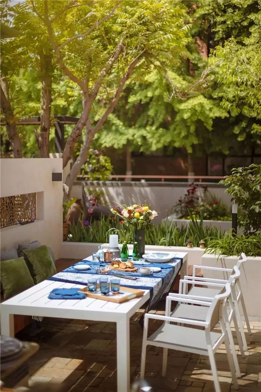 白色的桌椅陈设在树木下