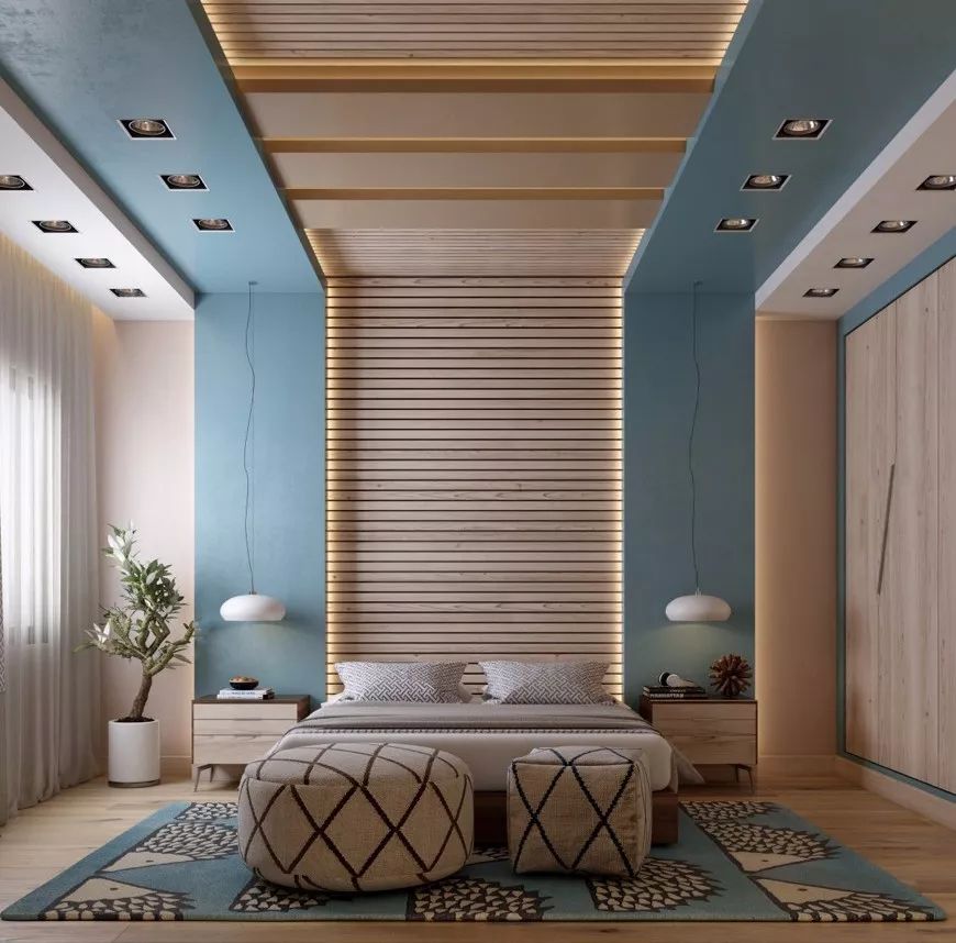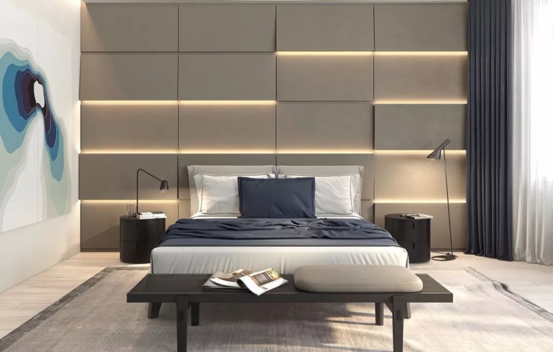 有些人为营造气氛而将床斜放且不靠墙,或为了闪避横梁而将床头悬空。床头直接悬空,或调头睡,会造成睡眠品质不好。如果因为空间的设计问题,床头没有实墙,可以用柜子代替。