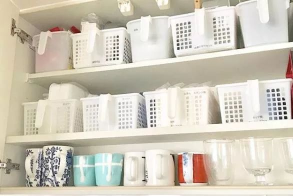 橱柜里清一色换上带把手的收纳篮,杯子也是合适两个人生活的数量。