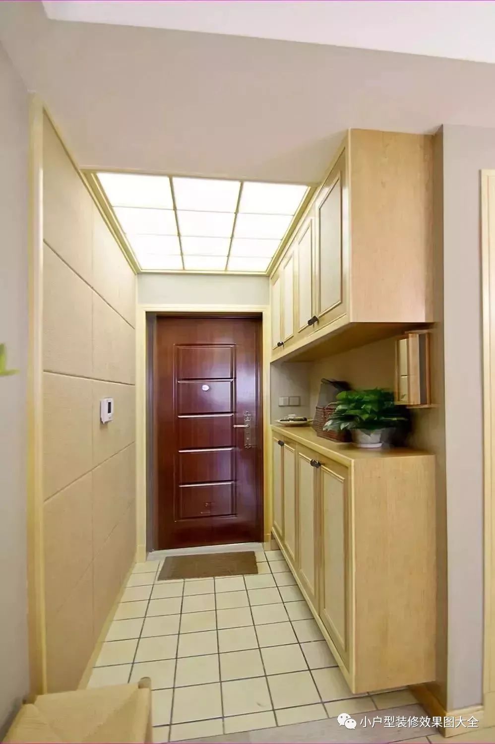 玄关是一个小型的过道空间,米色的防滑瓷砖,上方安装了一个吊顶灯,柔和的灯光,让人能够在进门的时候就感受到温馨感。玄关右面的墙壁进行了硬包处理,左手边是上下双层的收纳柜,下方留有的空格正好用来放一些鞋子。