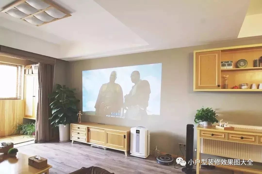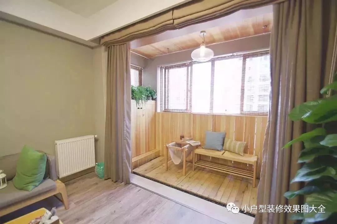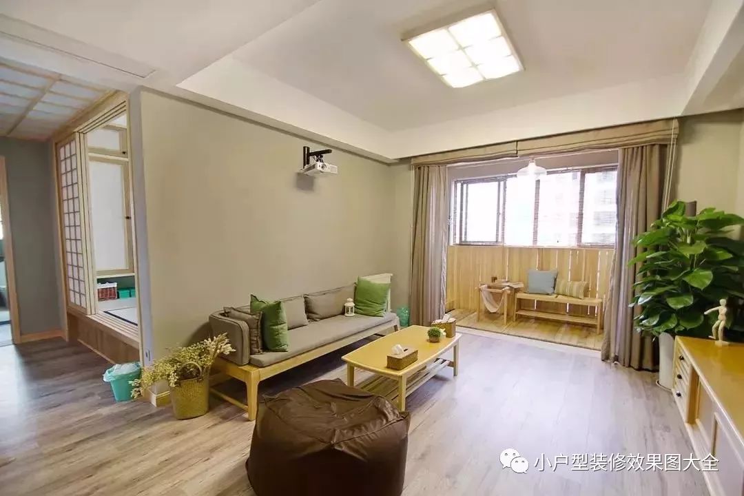 整个两居室中,家具和门窗都是原木材质的,带有浓浓的日式风格的禅意。将客厅和阳台打通,中间的隔断墙上设计了一面浅咖色的窗帘,阳台是纯原木打造的。不管是客厅还是阳台,搭配的都是小型沙发,更显得整个空间简约宽敞。客厅中没有放置电视,而是用投影仪代替,拥有更好地观影效果。