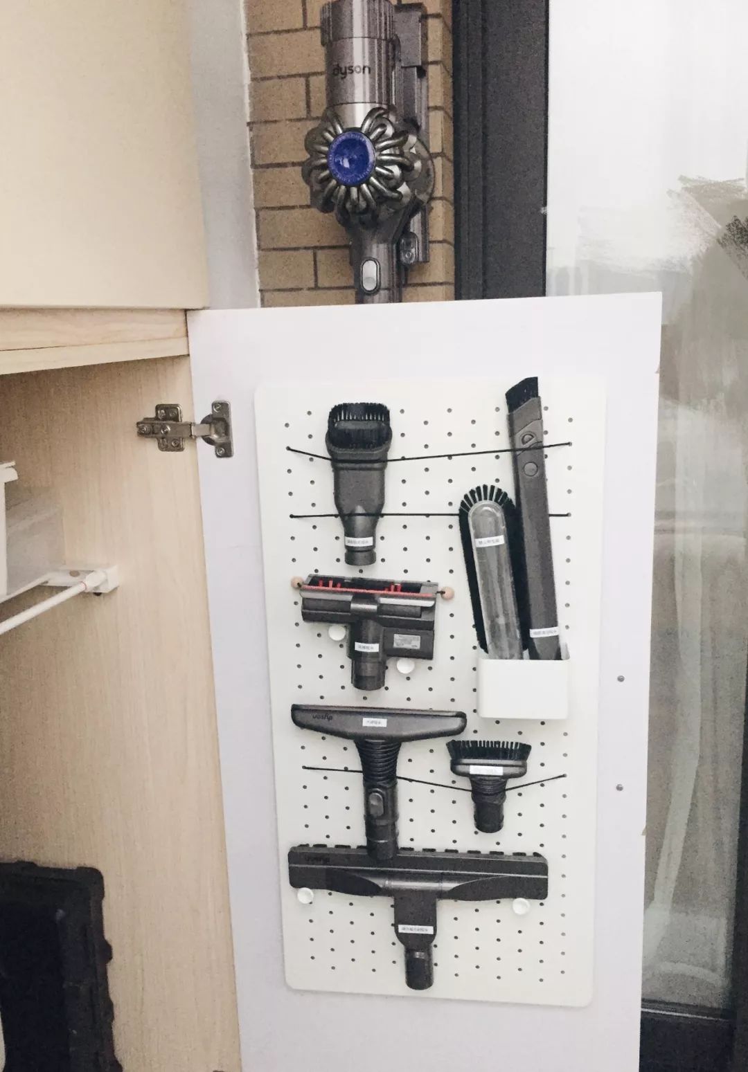 我放在阳台储物柜的门上,用来收纳戴森吸尘器的各个刷头。洞洞板上的橡皮筋和收纳盒都是这家店配的。