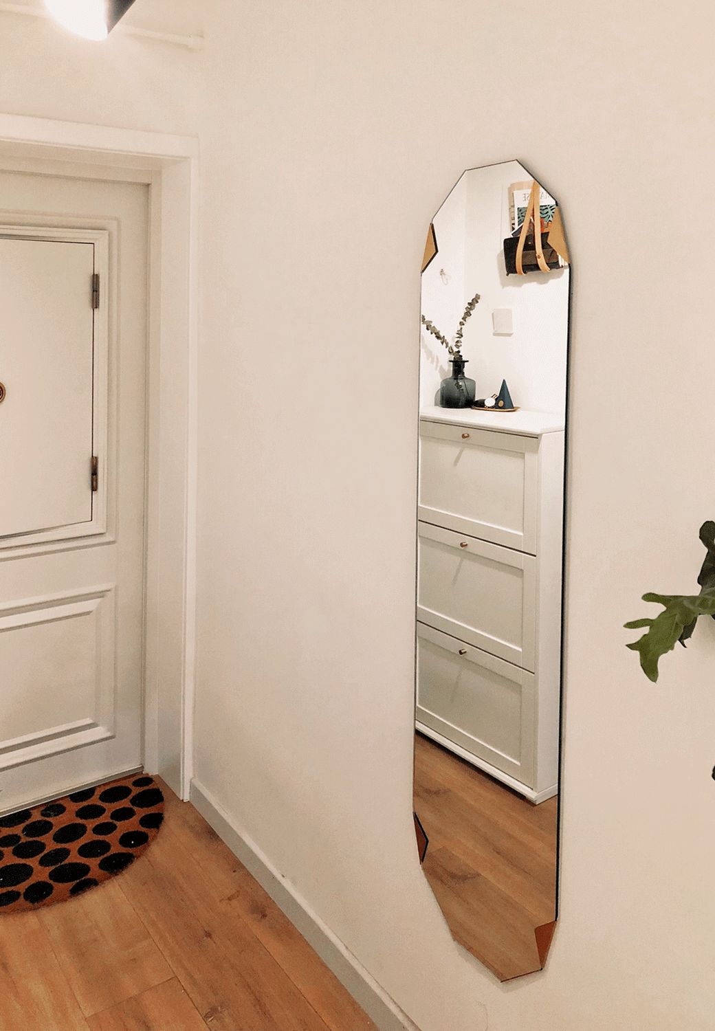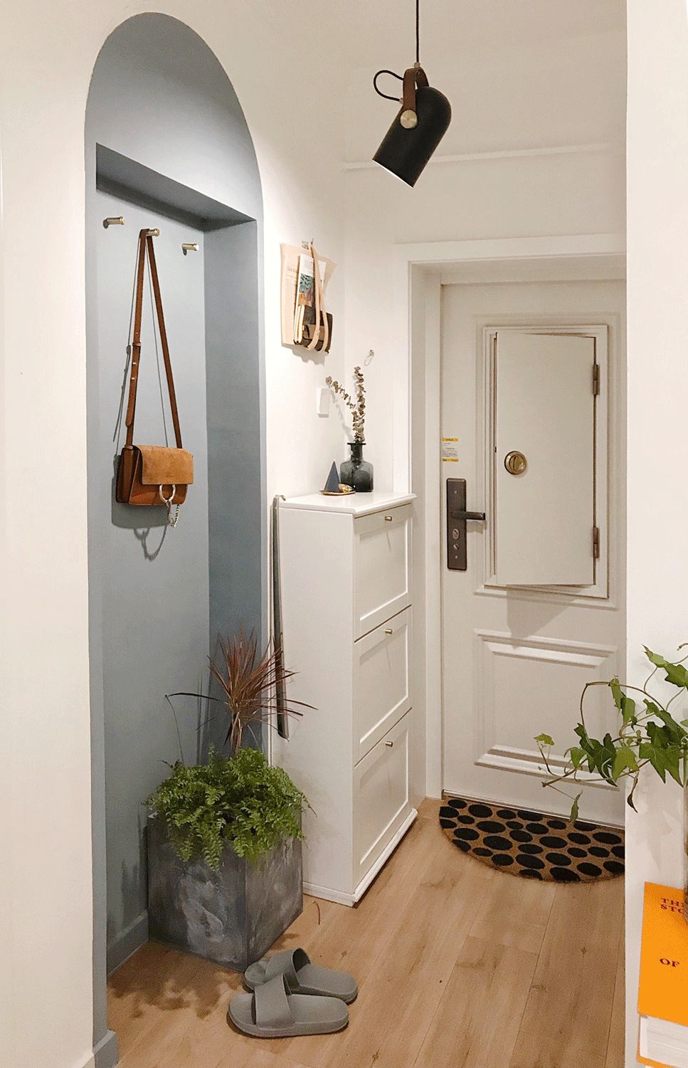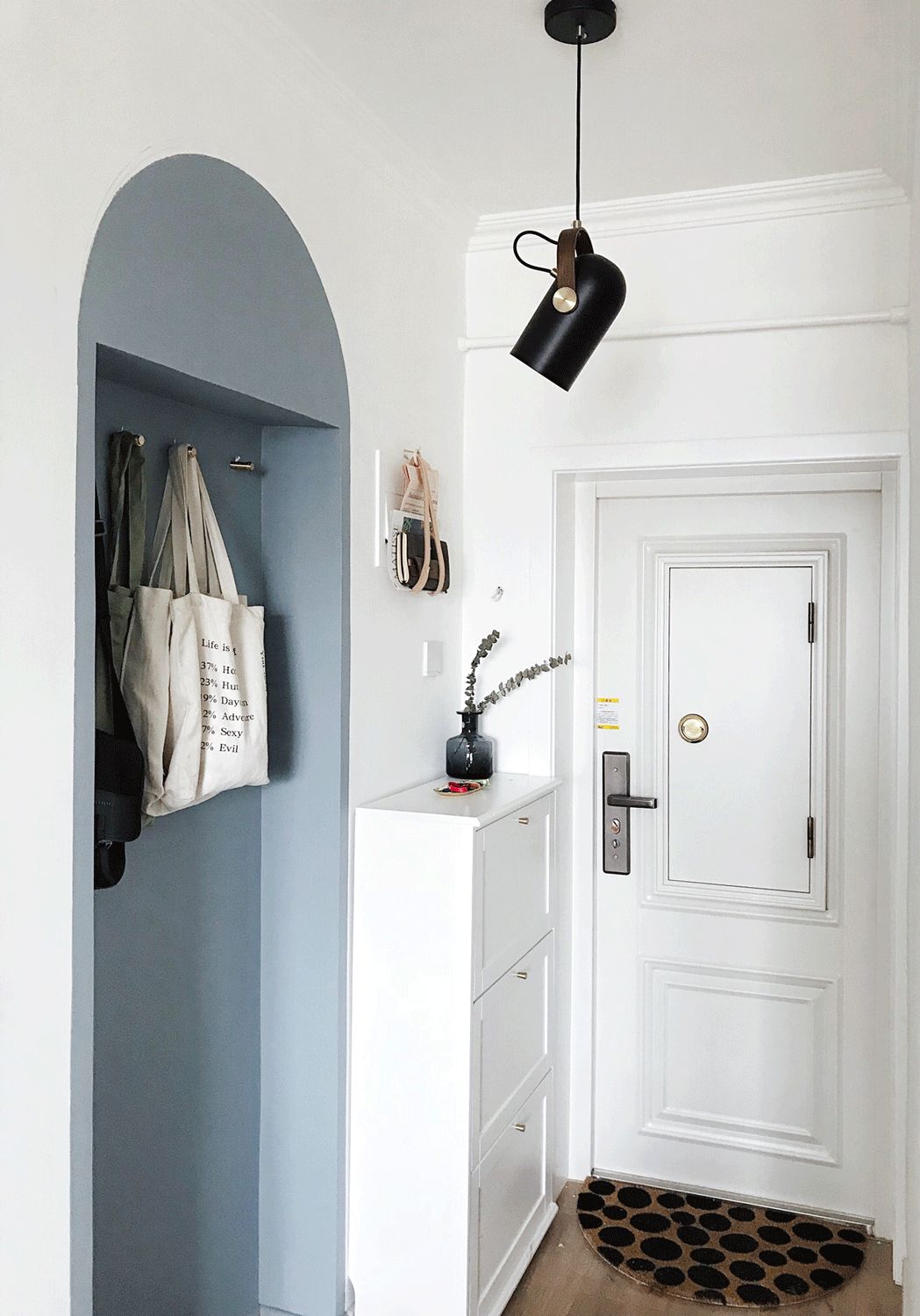 因为没能实现拥有一个拱形门,而且觉得玄关两个方形门洞挨着又会很奇怪。于是我突发奇想,力排众议徒手画了一个“拱形门”。当然颜色是斟酌很久的,考虑到去搭配沙发和橱柜的颜色,最后选的这个有点灰蓝色的调调,不仅好看也给家增加了一点趣味。还有要夸夸那个脚垫,在斗西老师直播里看到的,和我自己刷的拱形门很呼应哈哈。