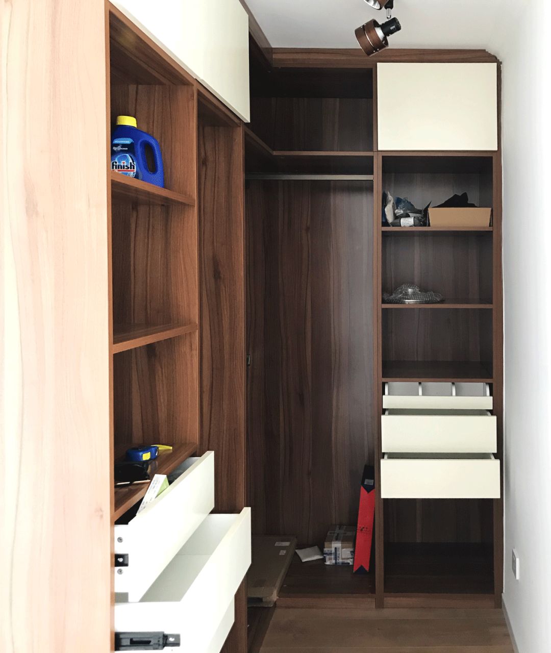 衣帽间的轨道灯选的是和柜体颜色材质一致的,很搭,我很喜欢。家里储物的地方主要靠这里了,目前空的地方还比较多,还有很大的发挥空间。
