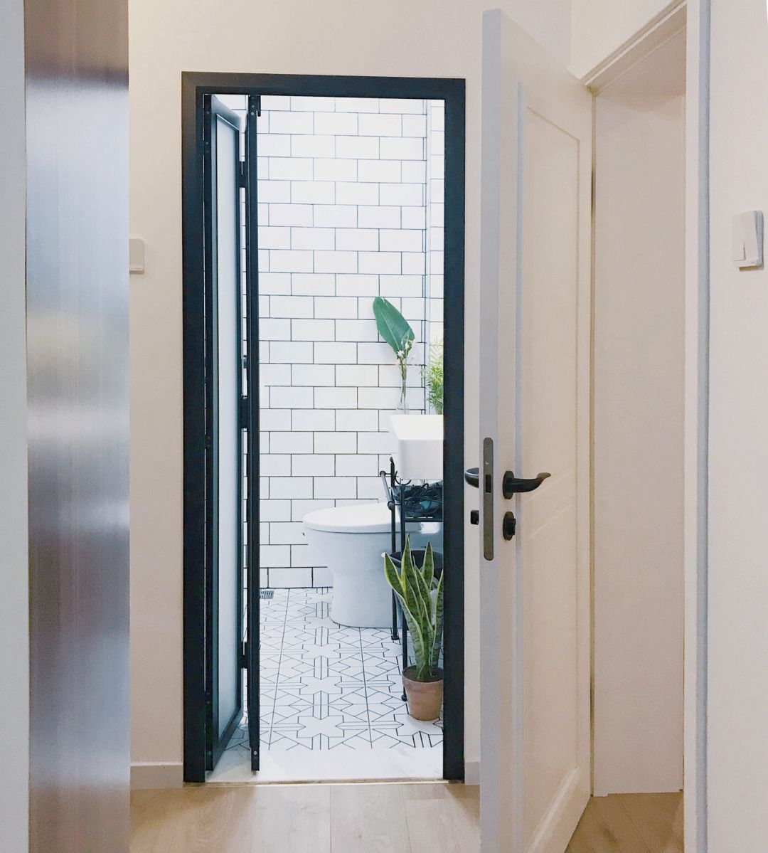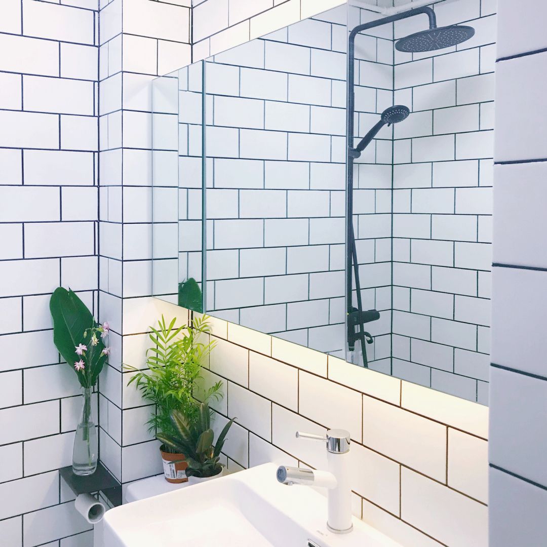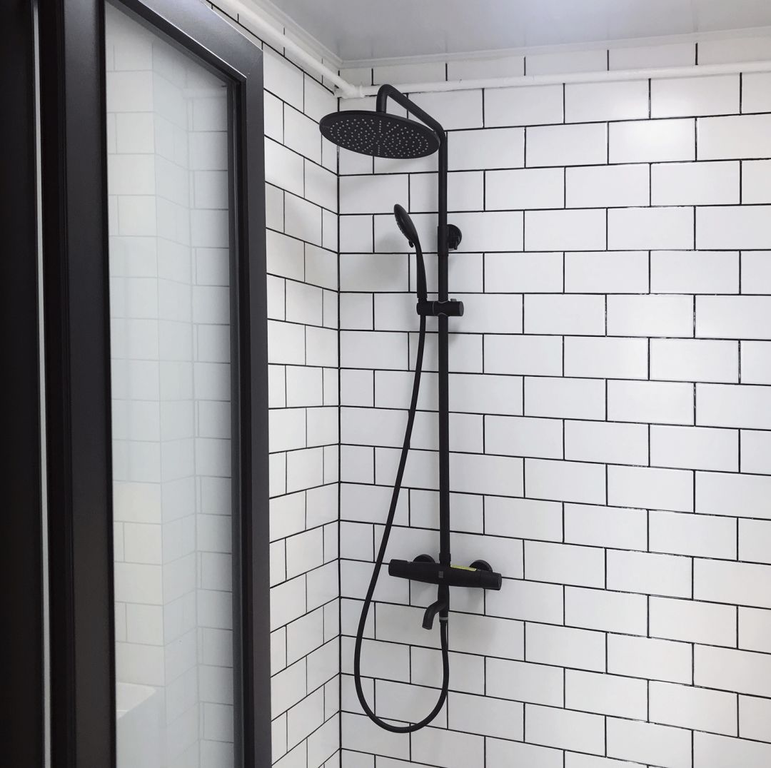 这里的瓷砖和厨房一样选择了工字拼小白砖,简洁又好看,黑色美缝也和淋浴的设备相呼应。