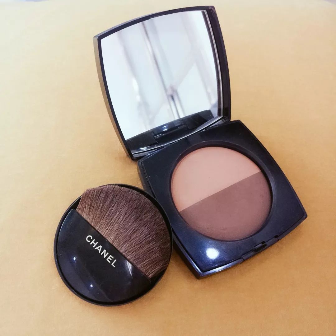 我前两年在香港买的CHANEL限定色两用腮红,一直用到现在,上半部分是腮红,而且是比较有气质的橘色,下半部分是大地色,能当侧影用。