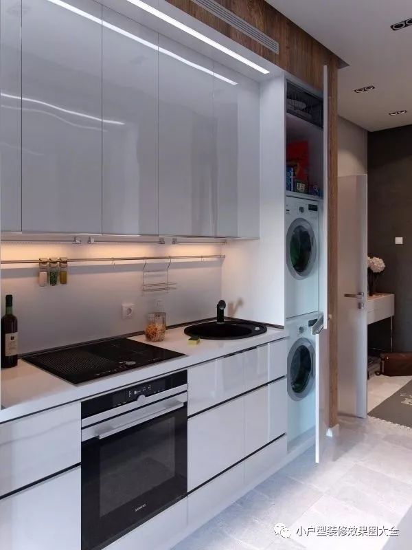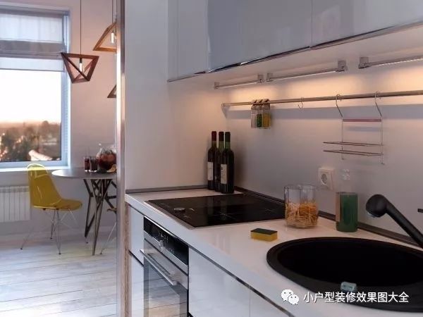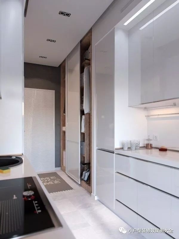 与玄关相连的开放式厨房是被设计在过道中的,两侧平行的格局,正好将过道的空间充分利用,收纳式的各种家用电器还不会真用太大的空间。