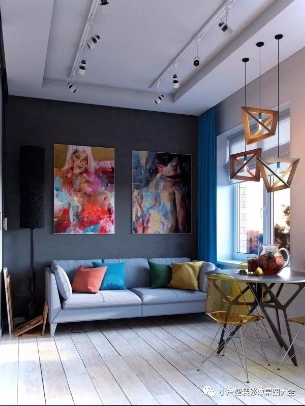 长条形灰木色地板简单一比较易打理,深灰色的背景墙和灰蓝色的沙发,吊顶上出于费用的考虑,并没有安装什么大的吊灯,而是用一些小吊顶,反而更有情调还节省电。