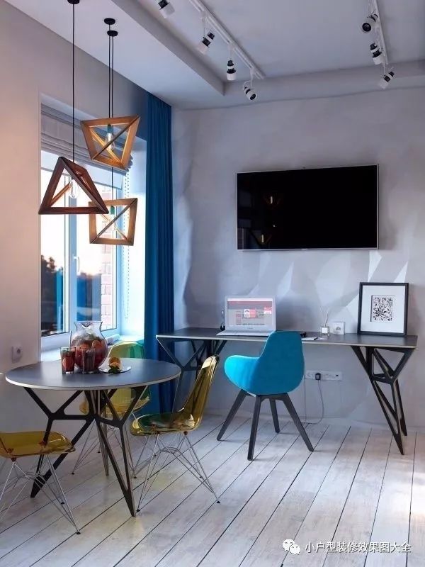 书房有一个小巧秒的设计,就是书桌安置在电视下边,既是办公的地方,也可以起到电视柜的作用。