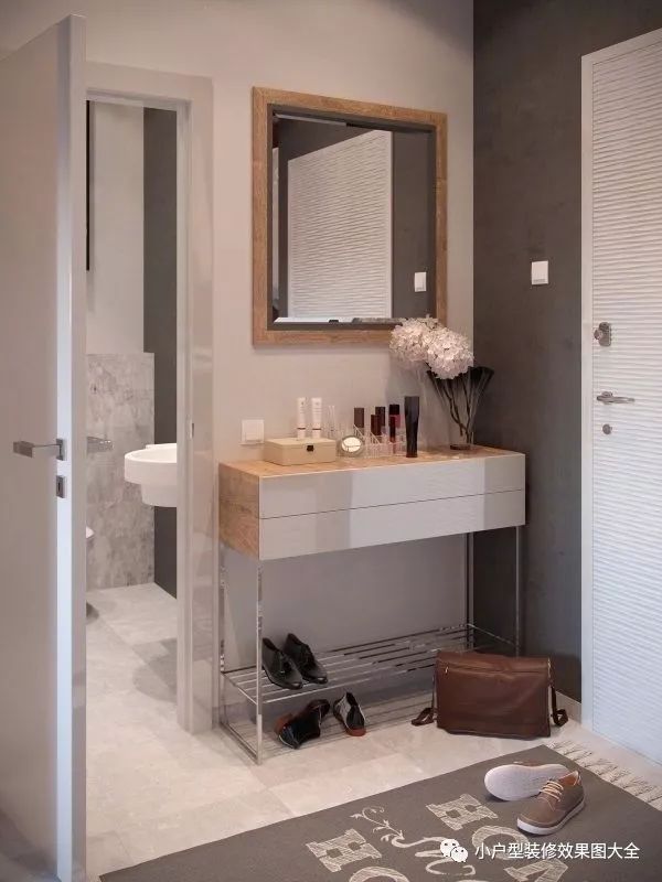 卫生间在玄关的右手边,梳妆台和鞋柜是一体的,美观还实用。