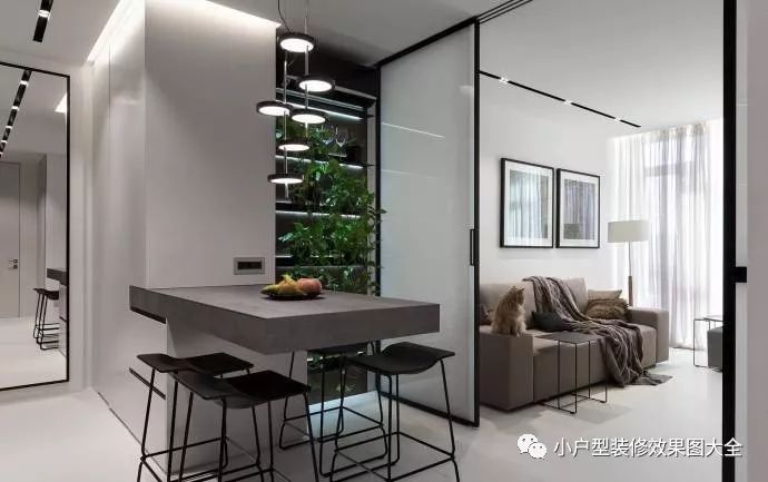 用镶黑边的磨砂玻璃的推拉门将客厅和餐厅隔断,让空间更有层次感。
