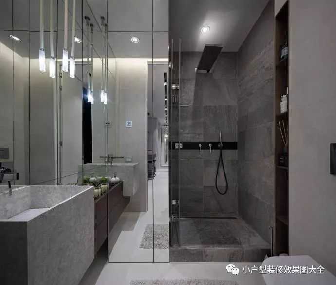 深色的卫生间格调,大理石的墙壁和地板,让这个卫生间还是很宽敞的,大大的镜子,又是增加了它的视觉宽度。