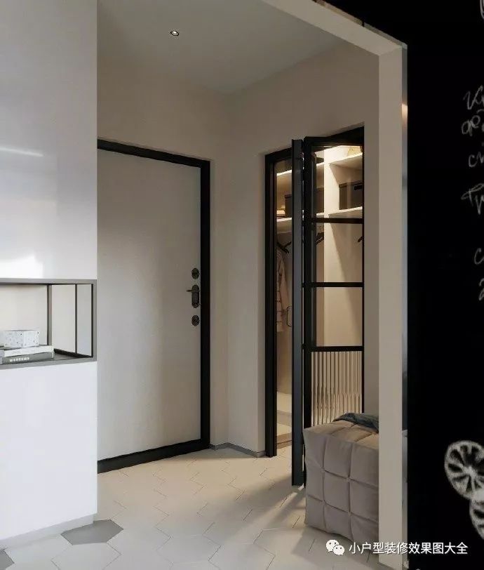进门的玄关并没有设计什么隔断墙,而是一个开发式的小空间,玄关的右手边是一个中空的上下双层的鞋柜,白色的墙壁和门用黑色边框装饰。玄关左手边就是一个黑色边框玻璃折叠门的衣帽间,门后放着一个方形的玄关软凳,很干爽整体。