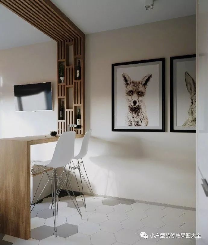 整个小户型的地板都是用黑白灰三色六边形地板砖铺就的,即使是地板在地上也是一个用心的设计,它是依照着墙上的画进行铺的,这样和墙壁的设计呈现了一种互补效果和整体协调感。