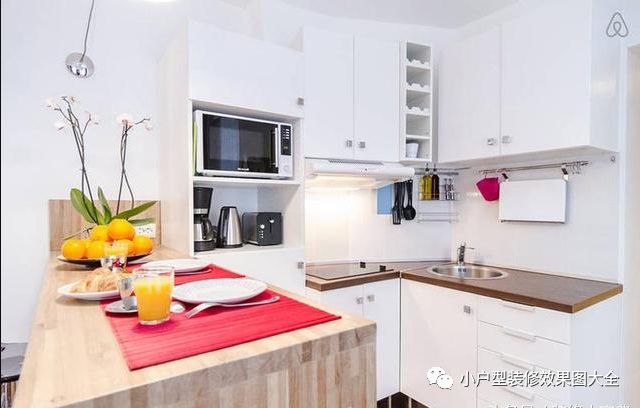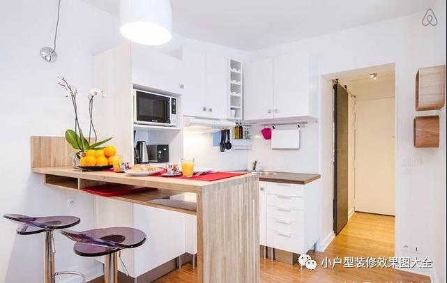 开放式的厨房,虽然小,但是功能还是很齐全的,旁边的吧台式的餐桌,美观实用。