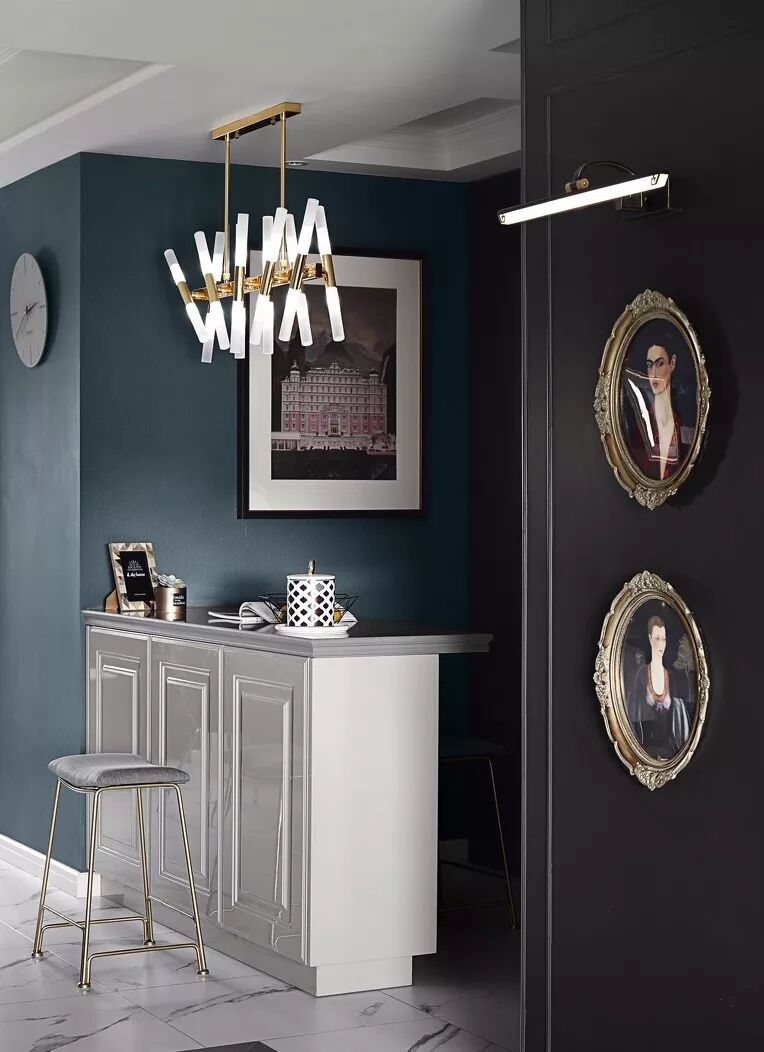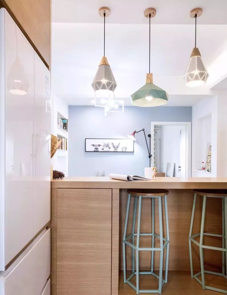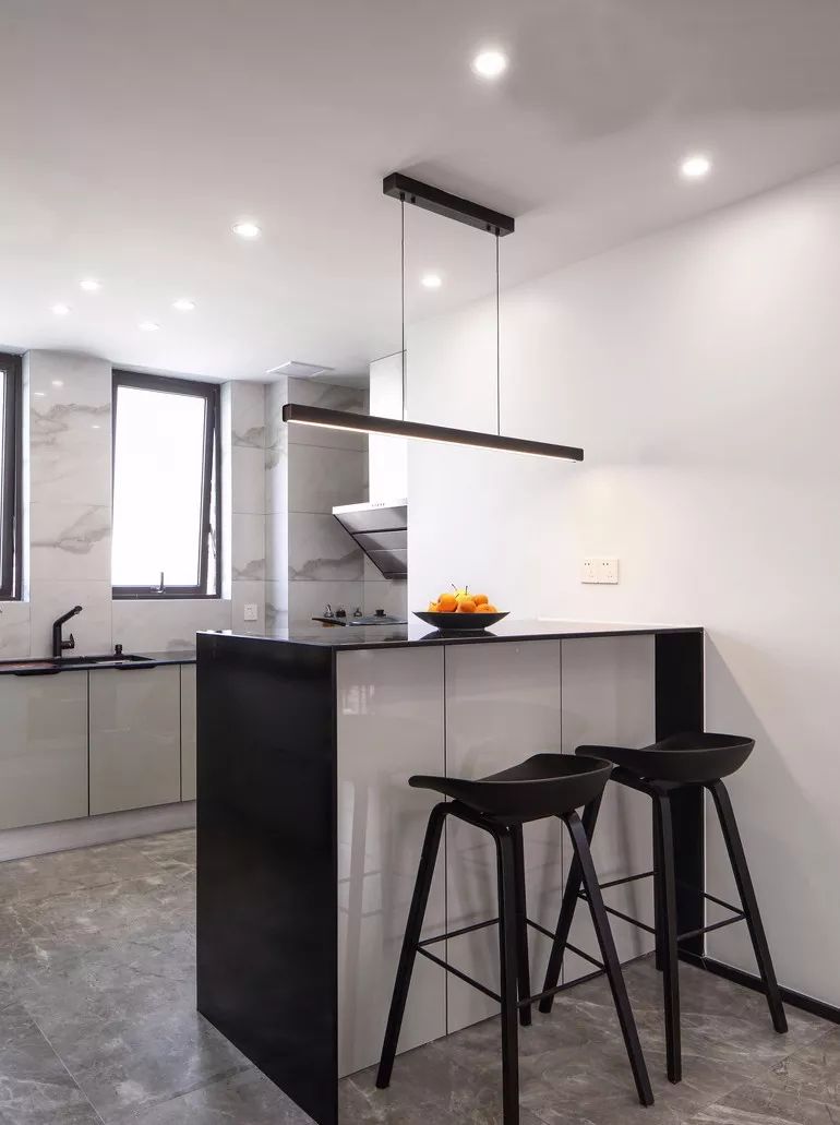 有些开放式餐厅也与客厅相连,做一个造型简单大方的吧台隔断,或放置一个酒柜,也不失为一种经济实用的设计。