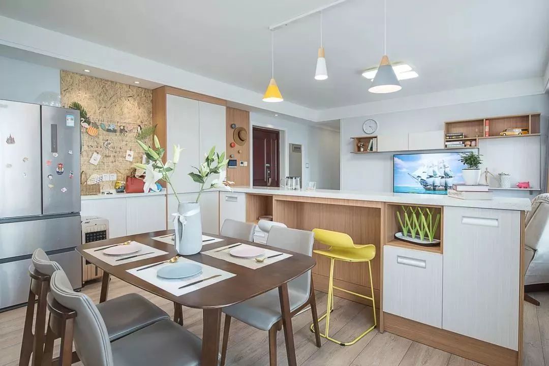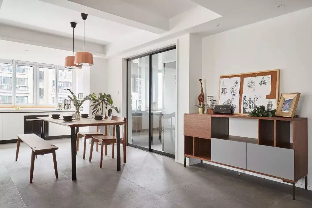 推拉门灵活隔开两个空间,没有了传统木门的厚重与封闭,更显时尚与透亮。餐厅与厨房隔而不断,还能有效地防止油烟。