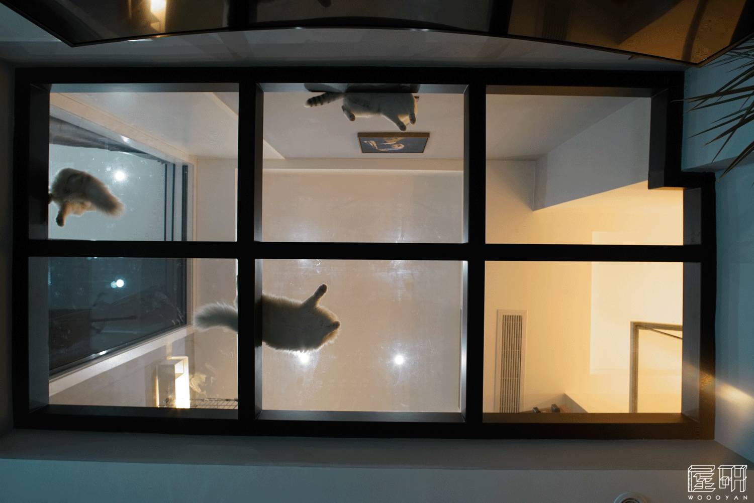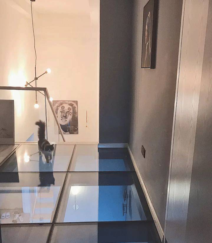 二楼的玻璃走廊就是为了看猫咪特别设计的。猫咪趴在上面,在楼下就能看到压扁的小肉垫,一看可以看好久,超级治愈。