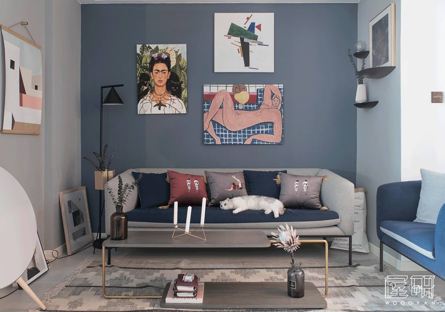 主色调选用蓝和灰,楼下到楼上有一个深浅的变化。最有代表性的是客厅墙面和沙发的配色。