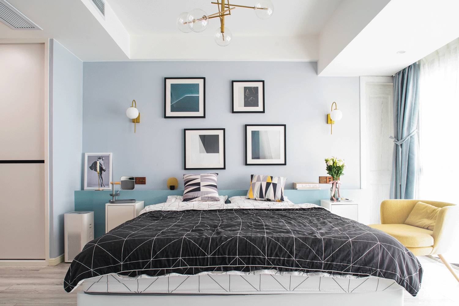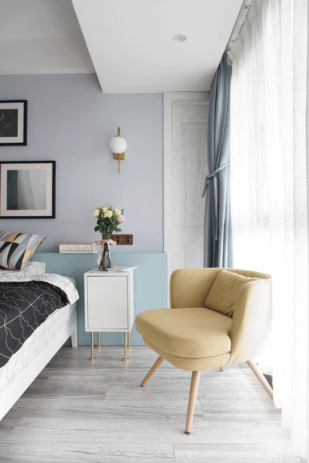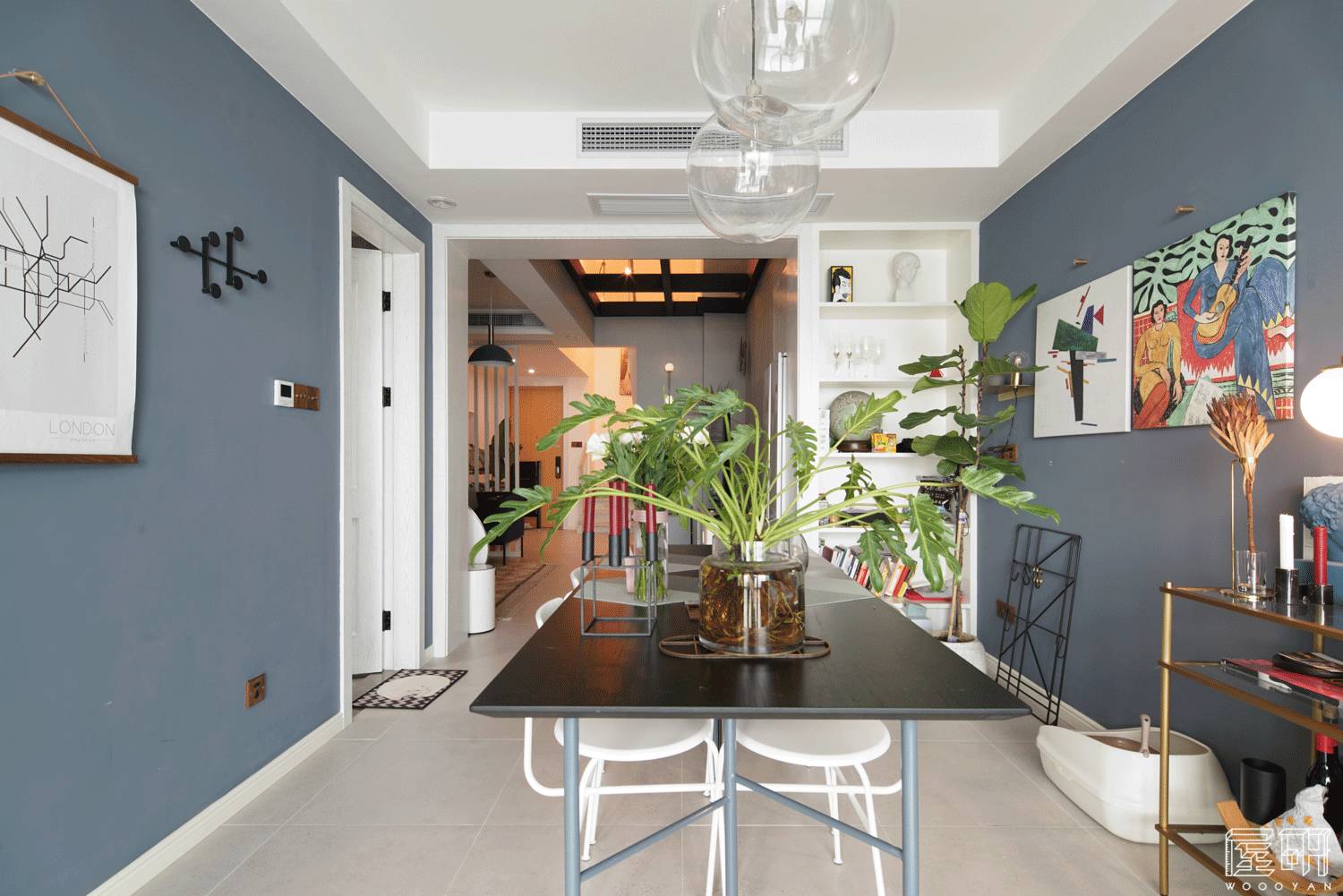 整个空间选择了蓝色和灰色,也有深浅的变化。在家具和装饰物的选择上也做了呼应,添加金属色或糖果色甚至用鲜花和植物进行点缀。墙漆色号:餐厅(546-6 蓝灰),客厅(518-4灰),玄关(白),卧室(1040-4雾霾蓝),from大师漆。