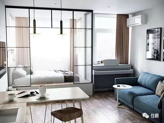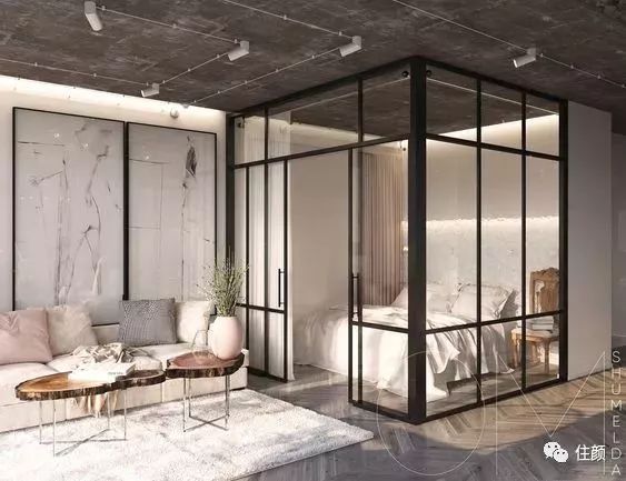 简洁的玻璃做卧室隔断非常合适,隔而不断加强采光,从视觉上放大了空间,实现了独立的睡眠区,晚上加个挂帘增添私密性,白天拉开一点儿也不挡光,比实体墙好用不止一点点。