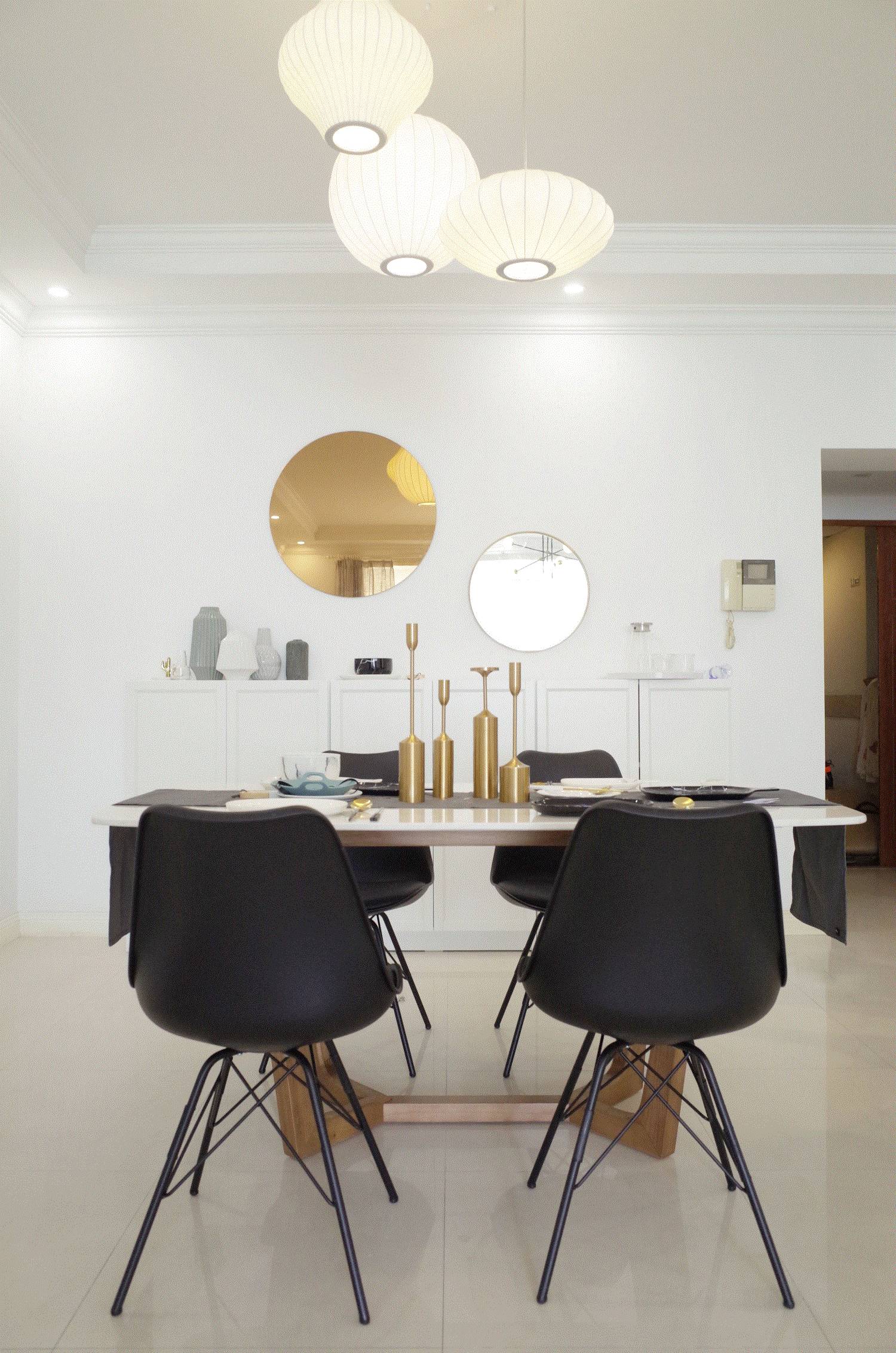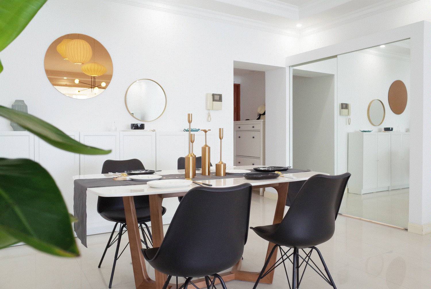 进门左手边的镜面墙面保留,镜子会显得整个空间非常开阔。这面墙其实还有一个储物功能,打开后是一个超级能装的储物柜。餐边柜的上面也有两面非常好看的圆镜子~