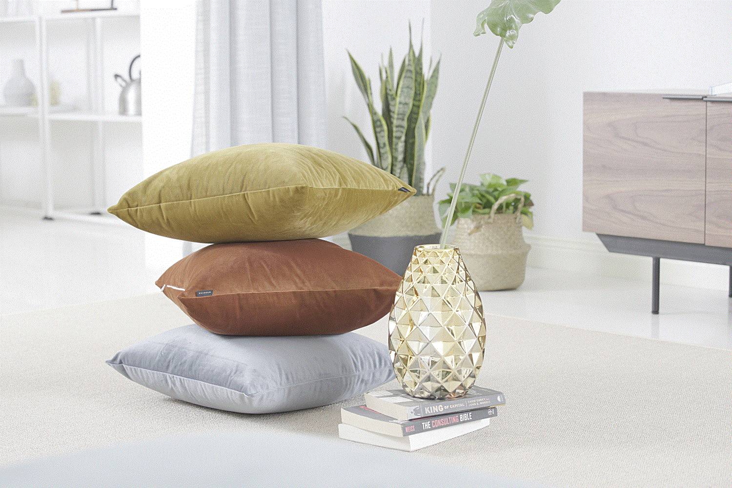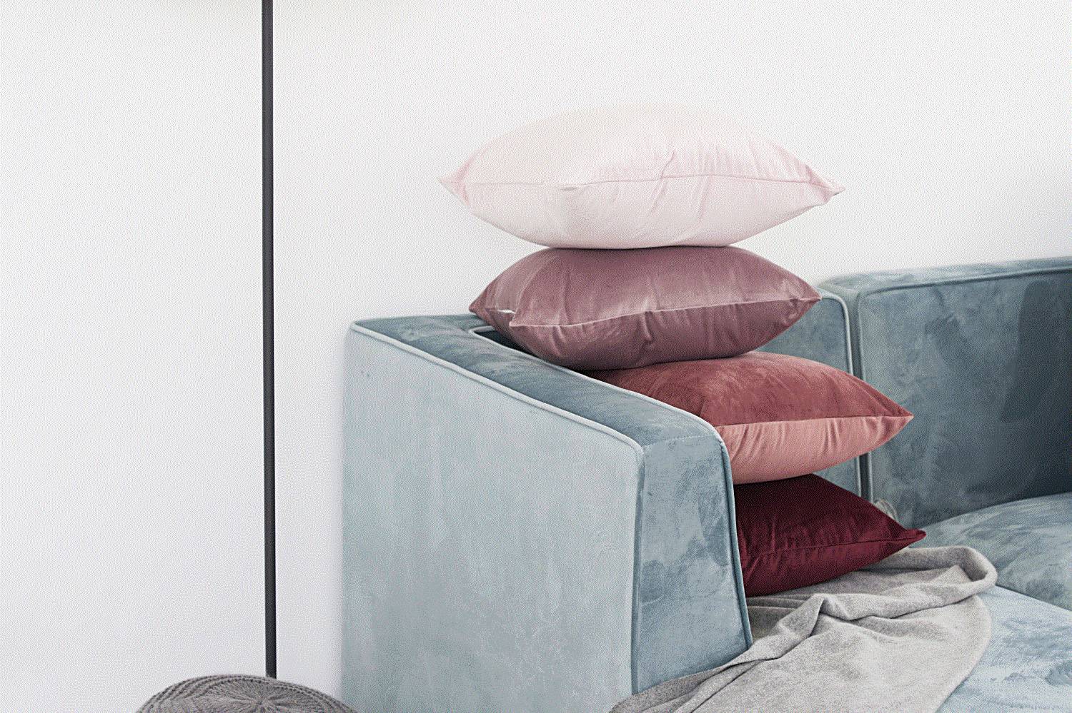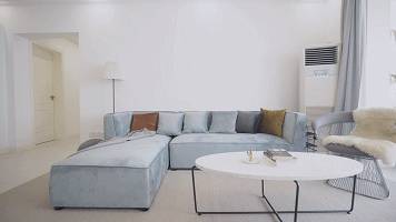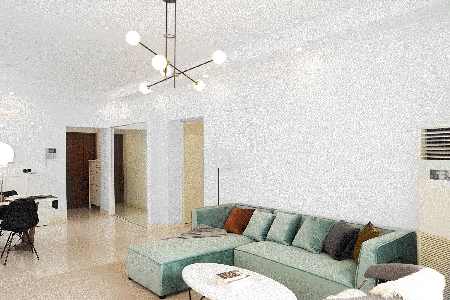 客厅原本的白色瓷砖还算干净大方。配上大面积的米灰色地毯,沙发也选的是天鹅绒的,再配上高品质抱枕,瓷砖的冷硬感瞬间就被中和掉了。