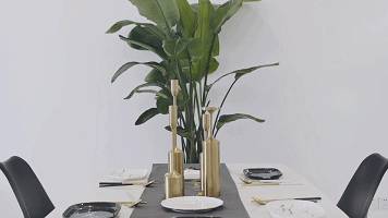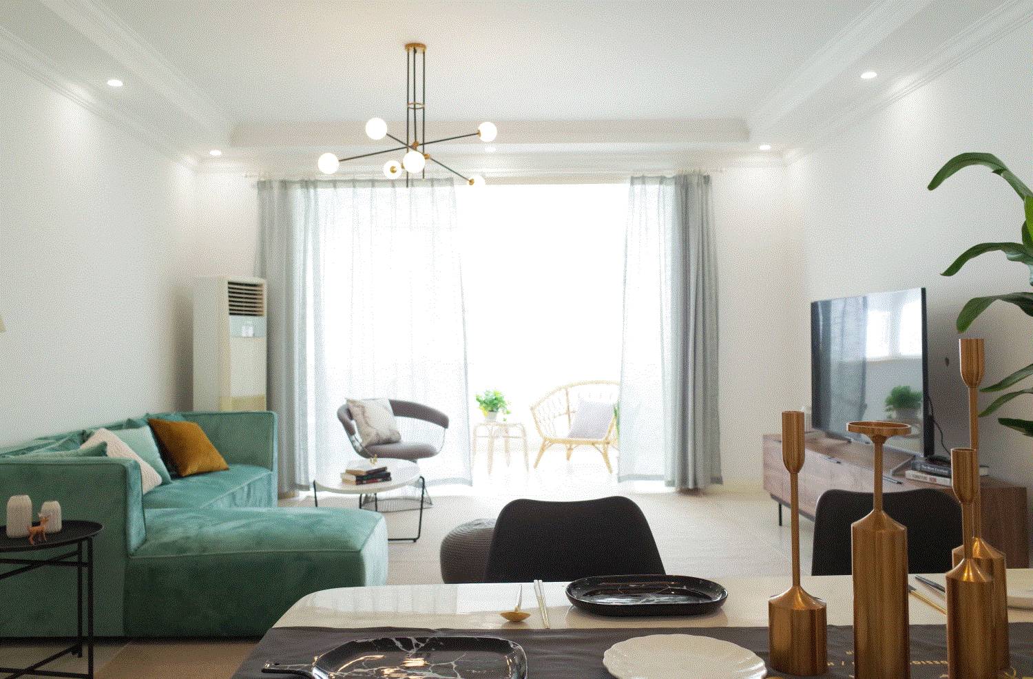 Nancy并不是简单的北欧风,因为她想要稍微中式的感觉,所以在传统的白灰色系中加入了一些绿色,天鹅绒和金属的材质增添复古和时髦感,绿植的加入又使整个空间自然灵动。