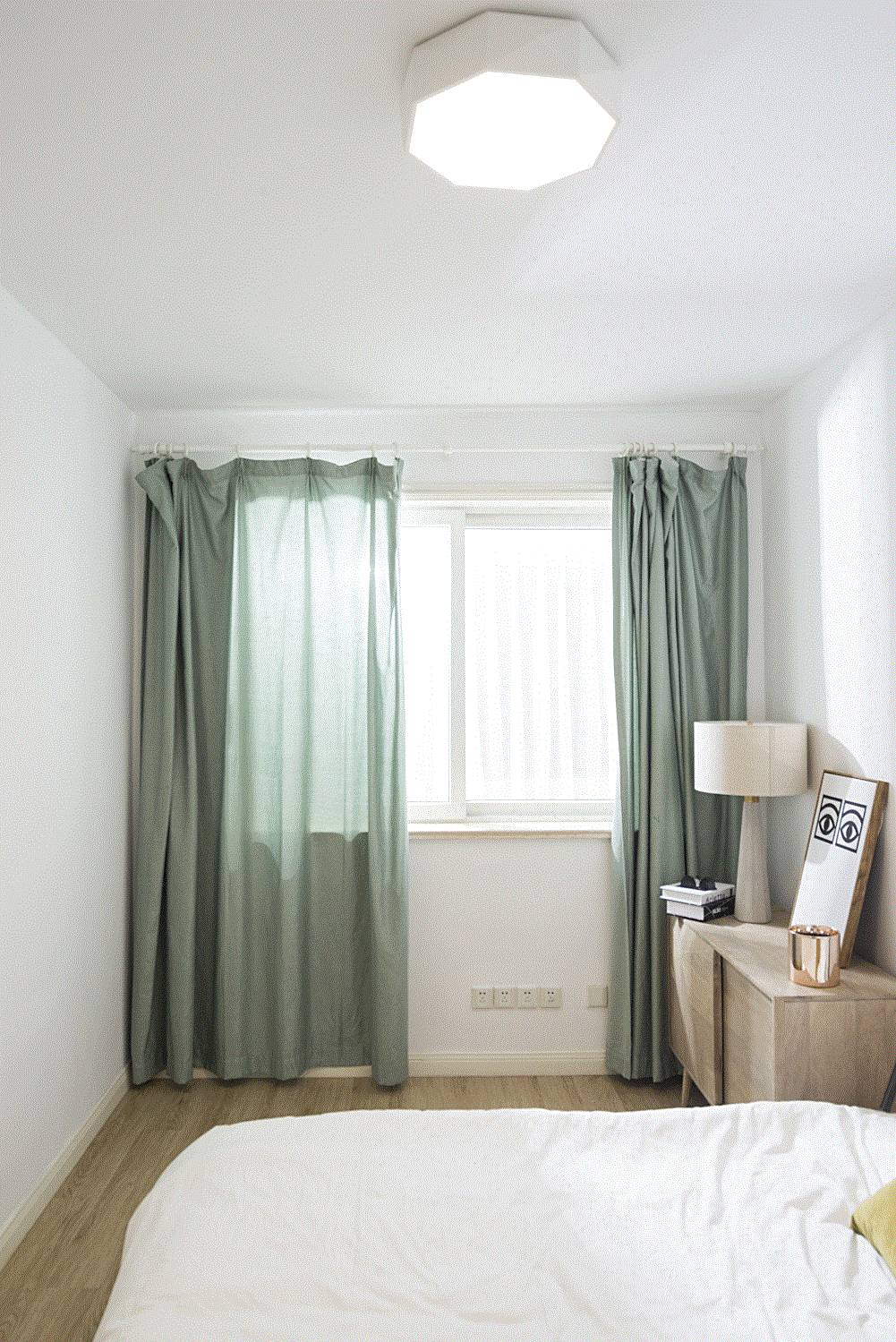 卧室的部分也是以白色为主,搭配原木色的地板和家具,以及绿色的窗帘和床上用品,再来点金属的小物,整个环境清爽又温馨。