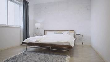 为了维持整体风格的统一,许多东西都是特别设计定制的,比如全部的窗帘。最特别的是主卧的一面大理石纹的背景,是设计师专门利用天然大理石花纹重新排版设计的,拯救了无聊的大白墙。