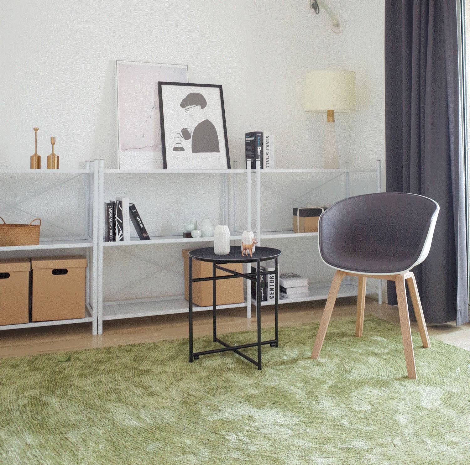 书房的部分也是一样,所不同的是绿色的部分体现在地毯上,当然书桌和椅子也选的木质元素,茶几和置物架的线条也非常简洁。